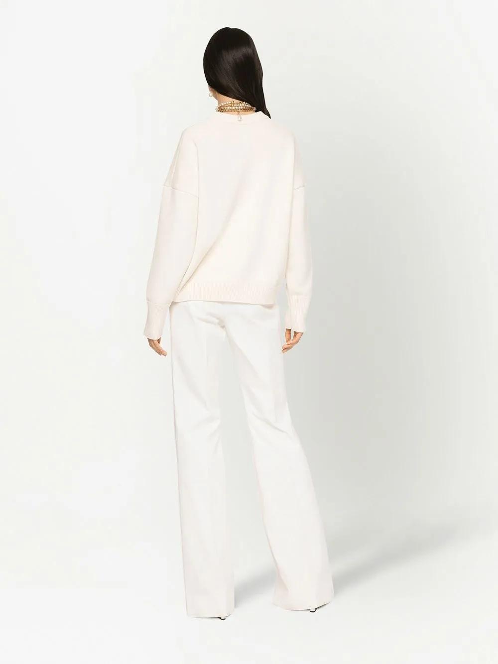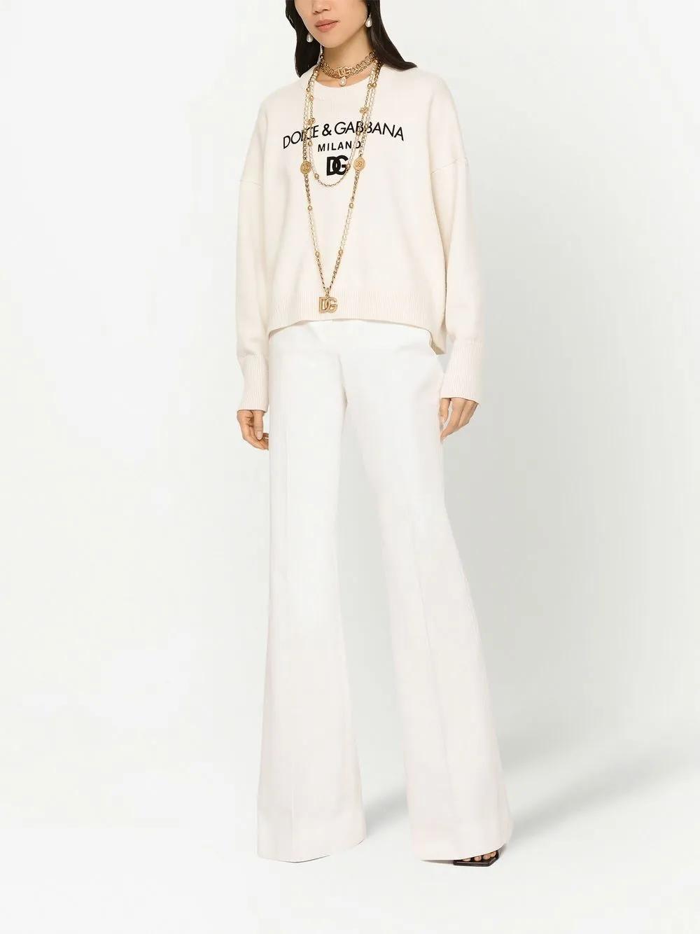 flocked-logo cashmere jumper from DOLCE & GABBANA featuring cream white, cashmere, crew neck, drop shoulder, long sleeves, flocked logo, straight hem and ribbed-knit edge.