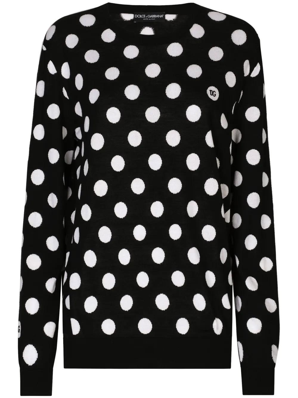 black/white virgin wool-silk blend intarsia knit polka dot pattern all-over logo pattern crew neck long sleeves ribbed cuffs and hem