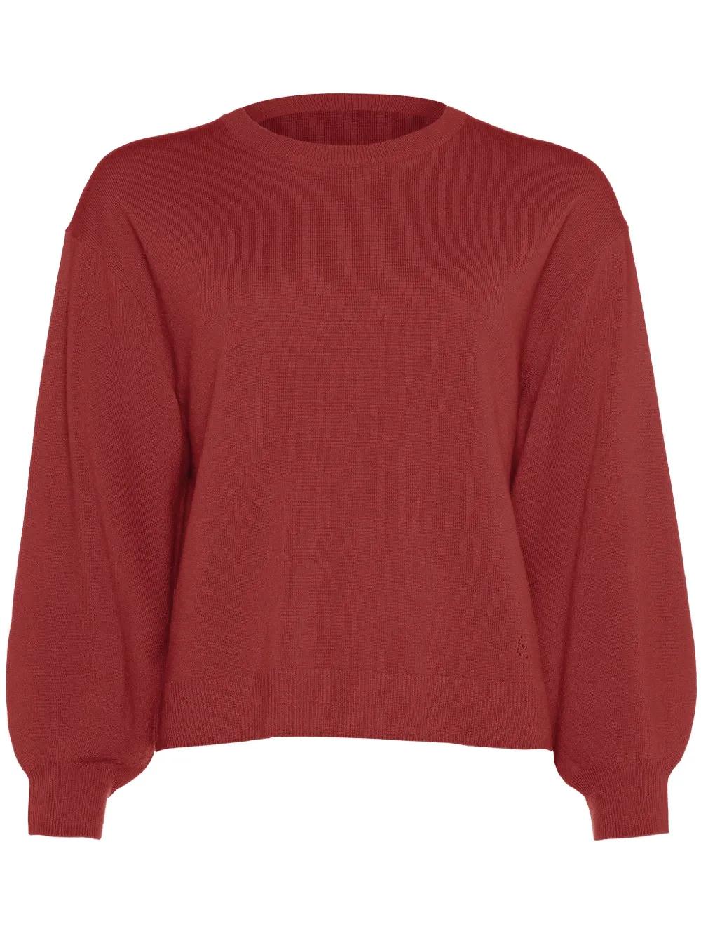 rust red wool-cashmere blend fine knit ribbed-knit edge crew neck drop shoulder long sleeves embroidered logo to the side ribbed cuffs and hem