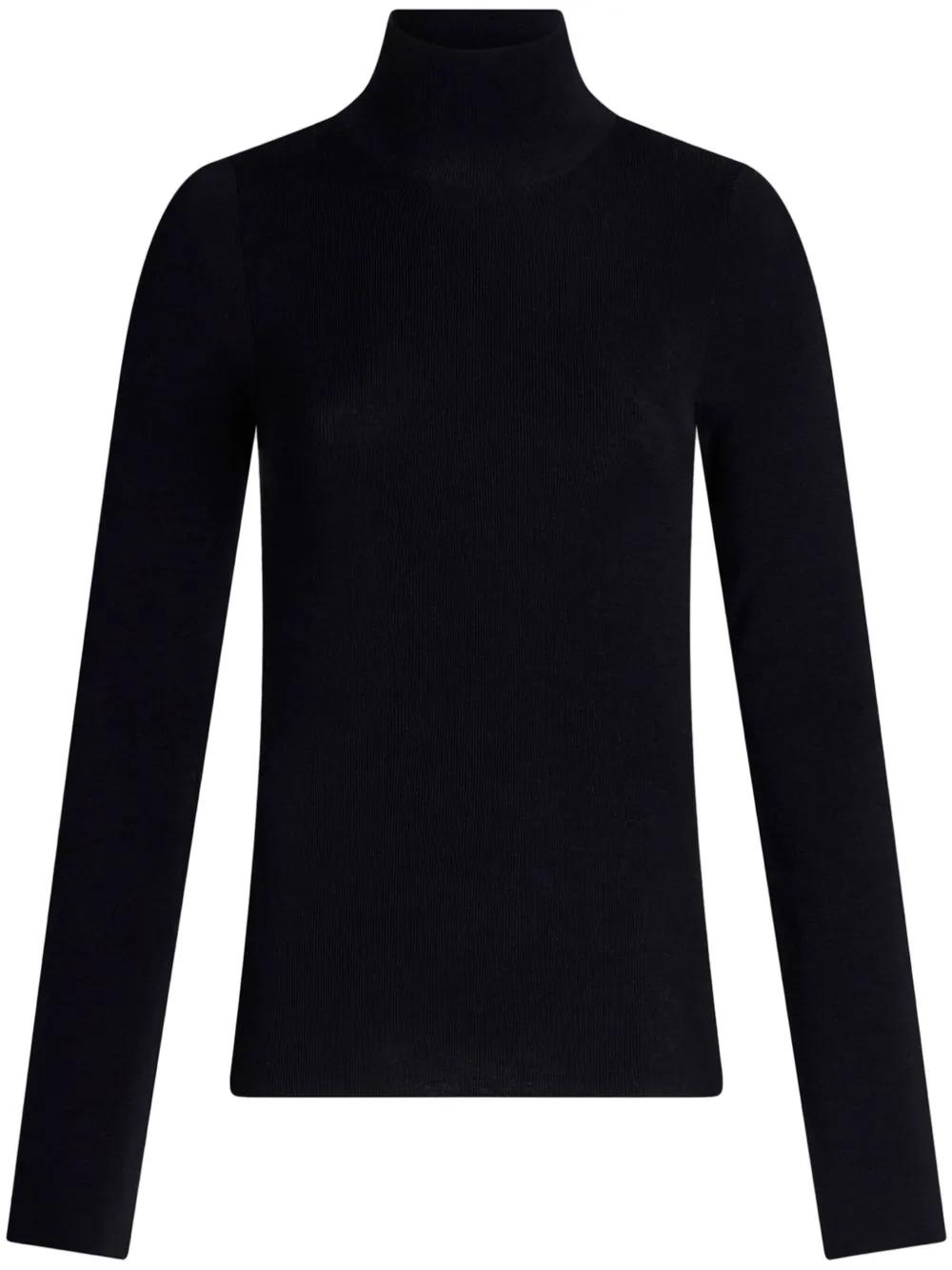navy blue wool fine knit high neck long sleeves straight hem pull-on style