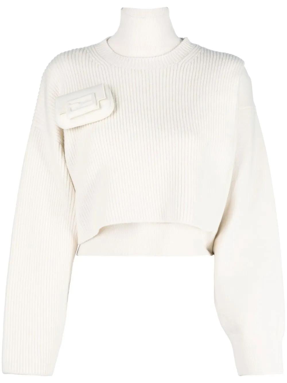 white wool-cashmere blend chunky ribbed knit debossed logo to the front front flap pocket roll neck drop shoulder long sleeves