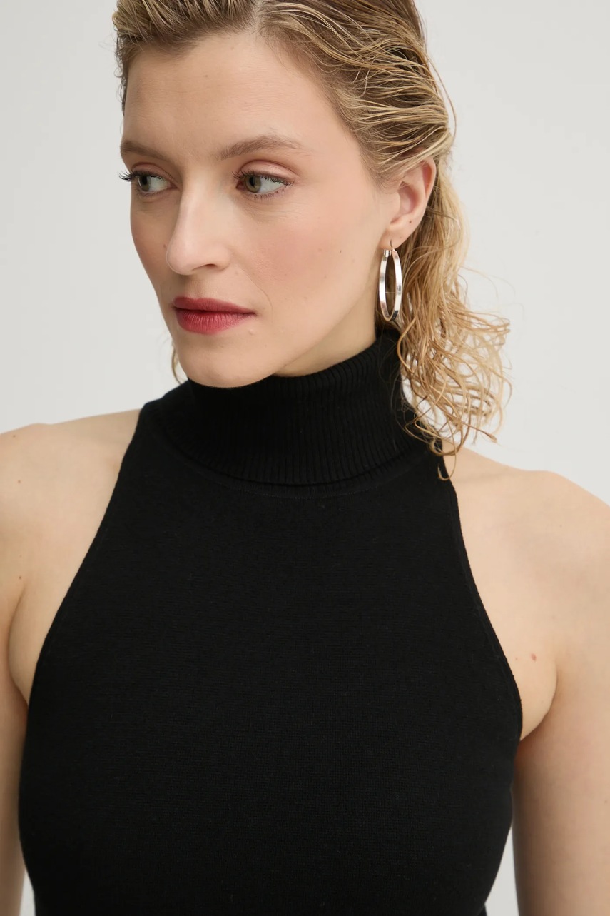 - Bawełna organiczna uprawiana jest bez użycia niebezpiecznych dla zdrowia substancji chemicznych, chemicznych środków szkodnikobójczych czy nawozów sztucznych. - Prosty, nie blokujący ruchów fason. - Model z golfem. - Długość: 47 cm. - Szerokość pod pachami: 38 cm. - Wymiary podane dla rozmiaru: S.
