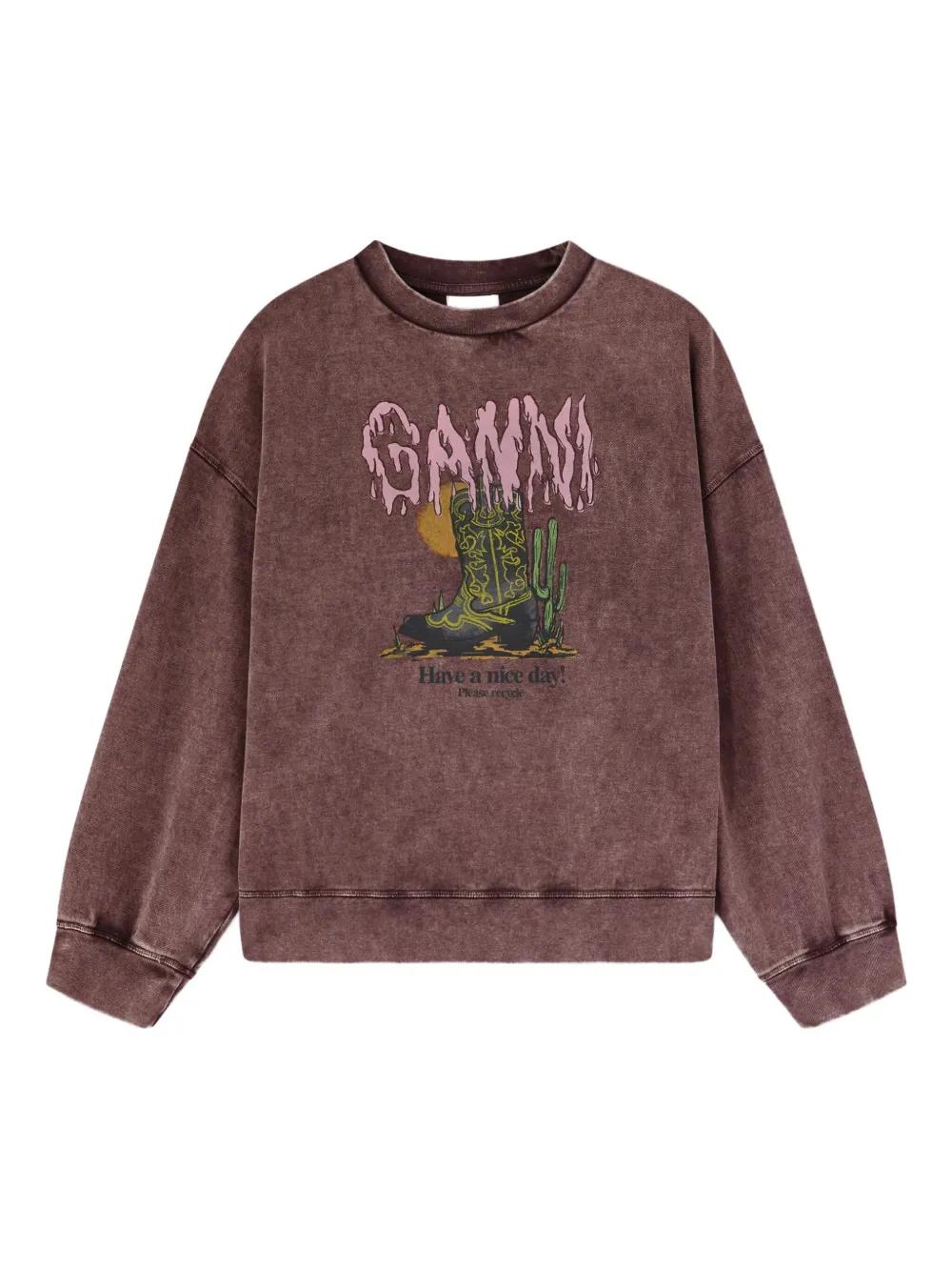 brown graphic print round neck long sleeves ribbed hem and cuffs
