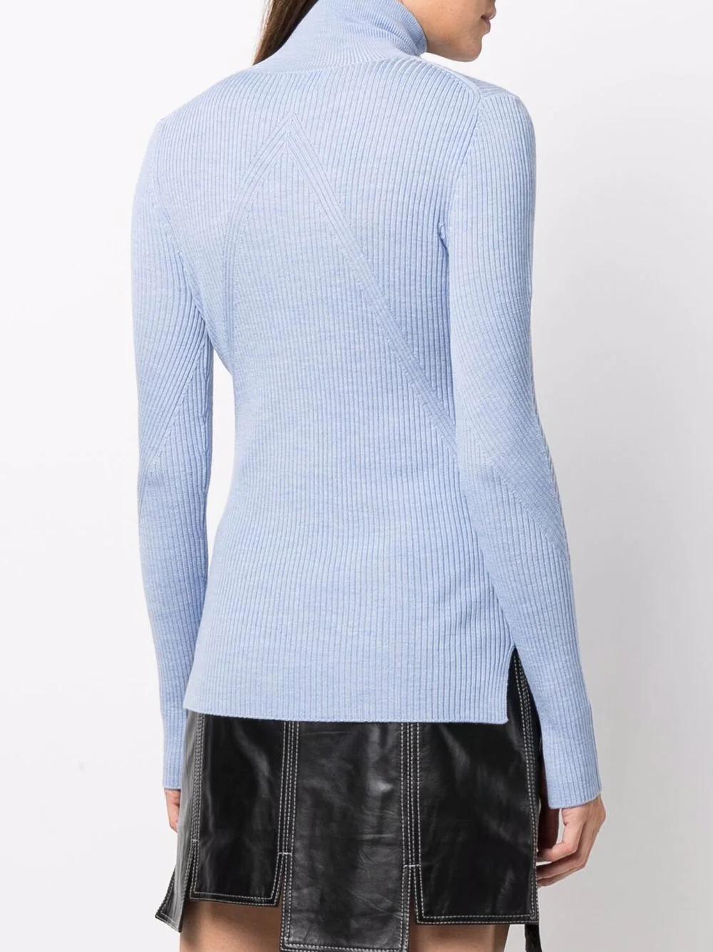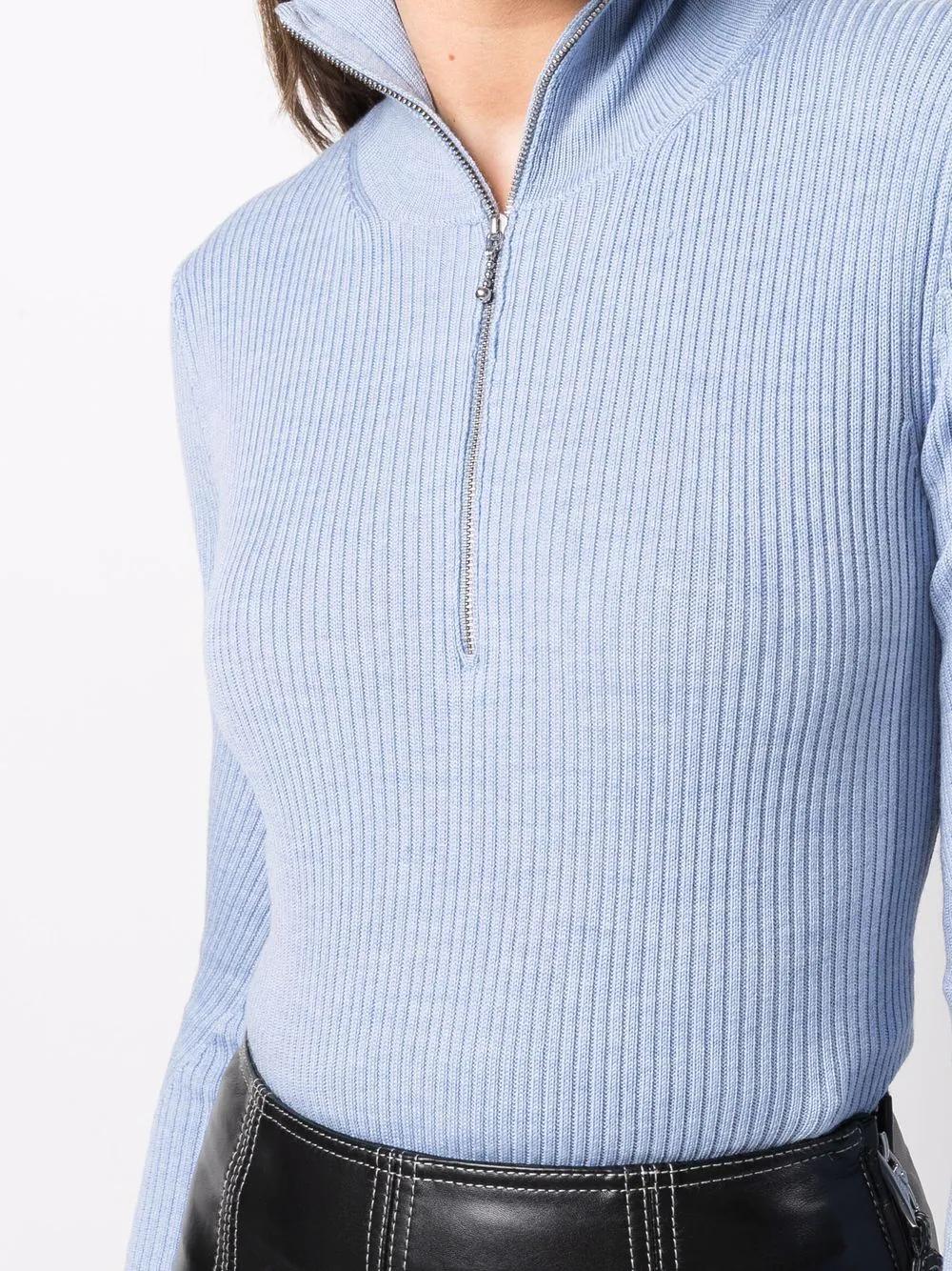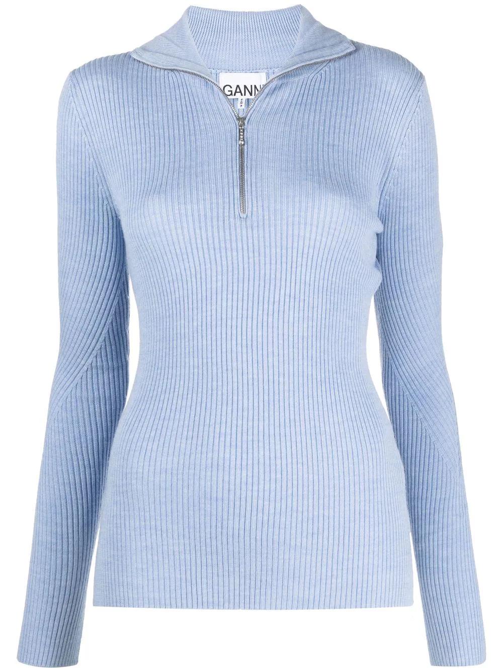 Blue merino ribbed-knit long-sleeve jumper from GANNI featuring ribbed knit, spread collar, short front zip fastening and long sleeves.