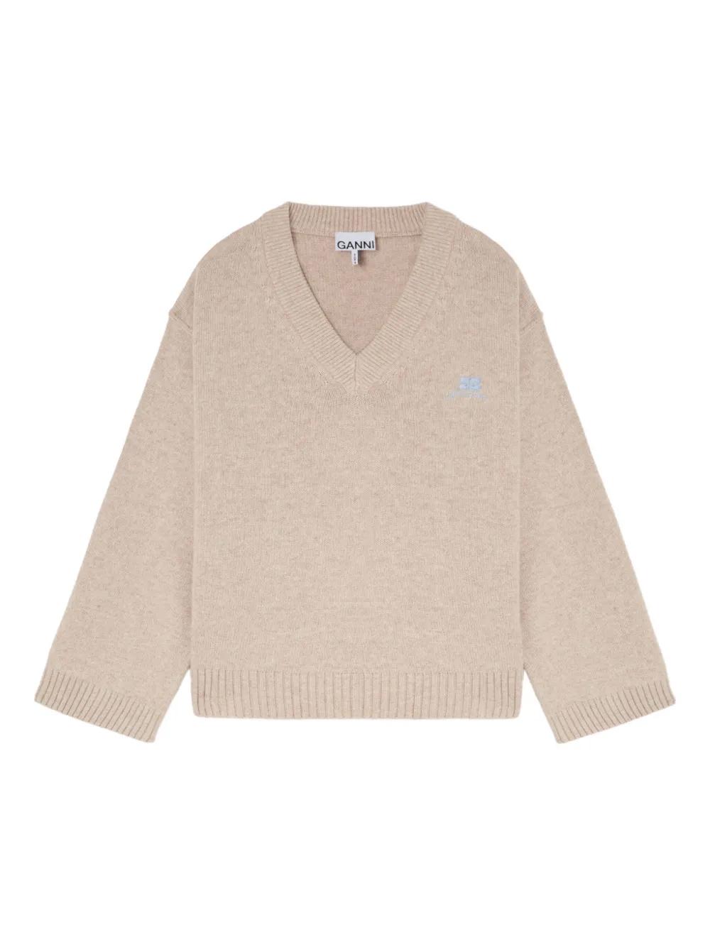 light brown V-neck ribbed hem and cuffs long sleeves embroidered detail