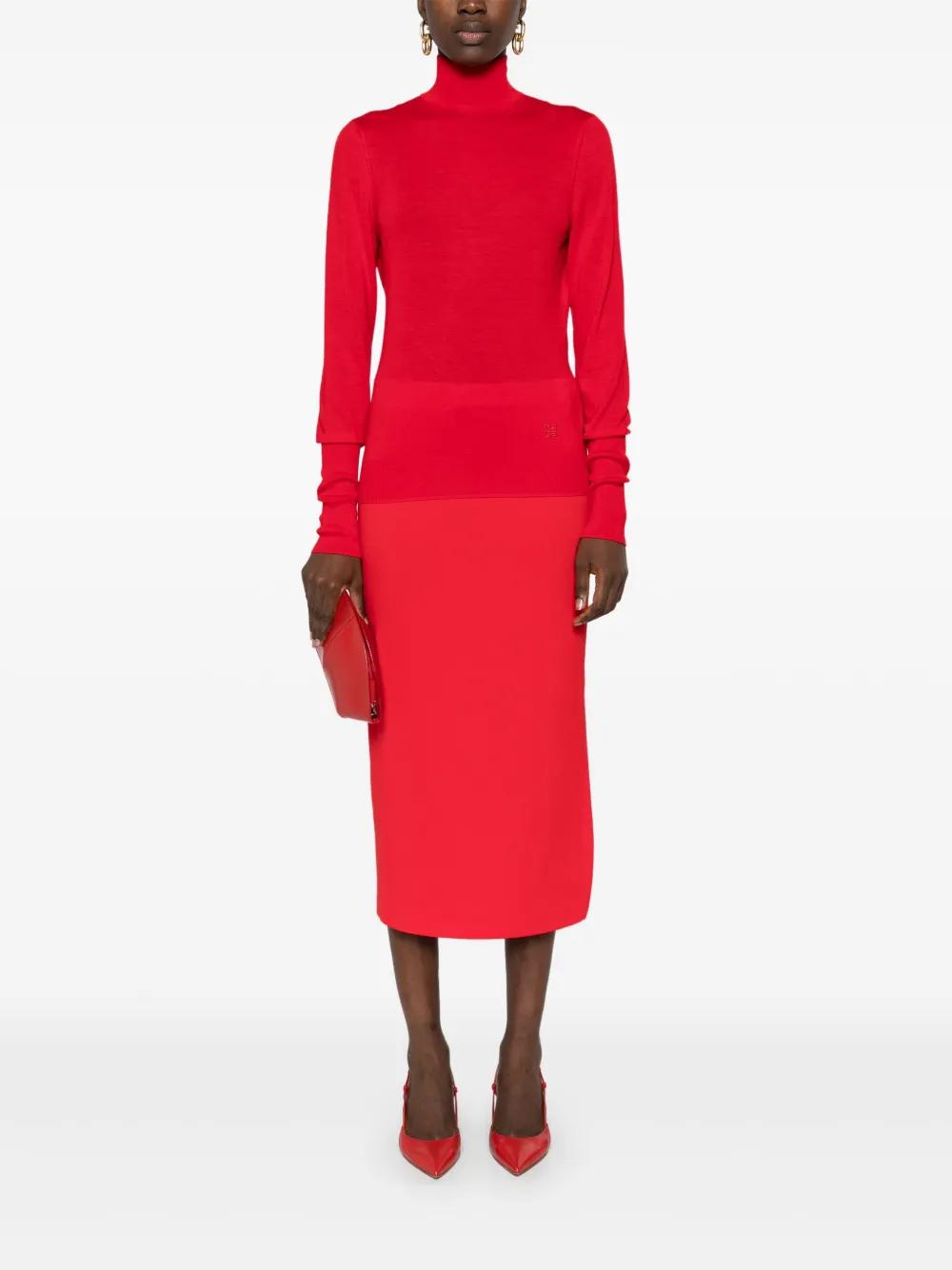 cardinal red wool fine knit draped open back ribbed high neck long sleeves ribbed cuffs and hem