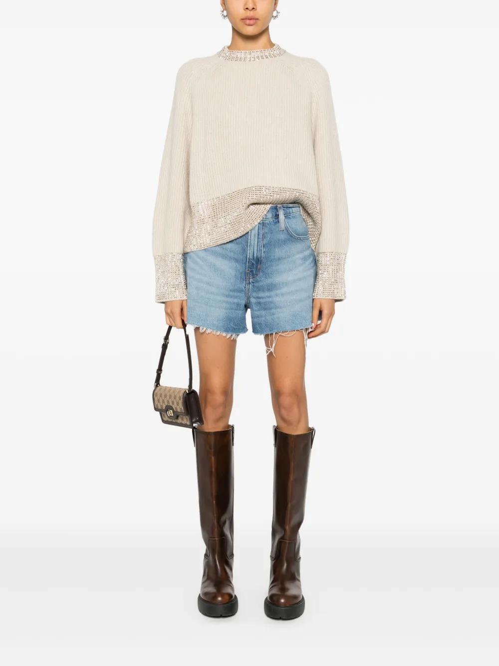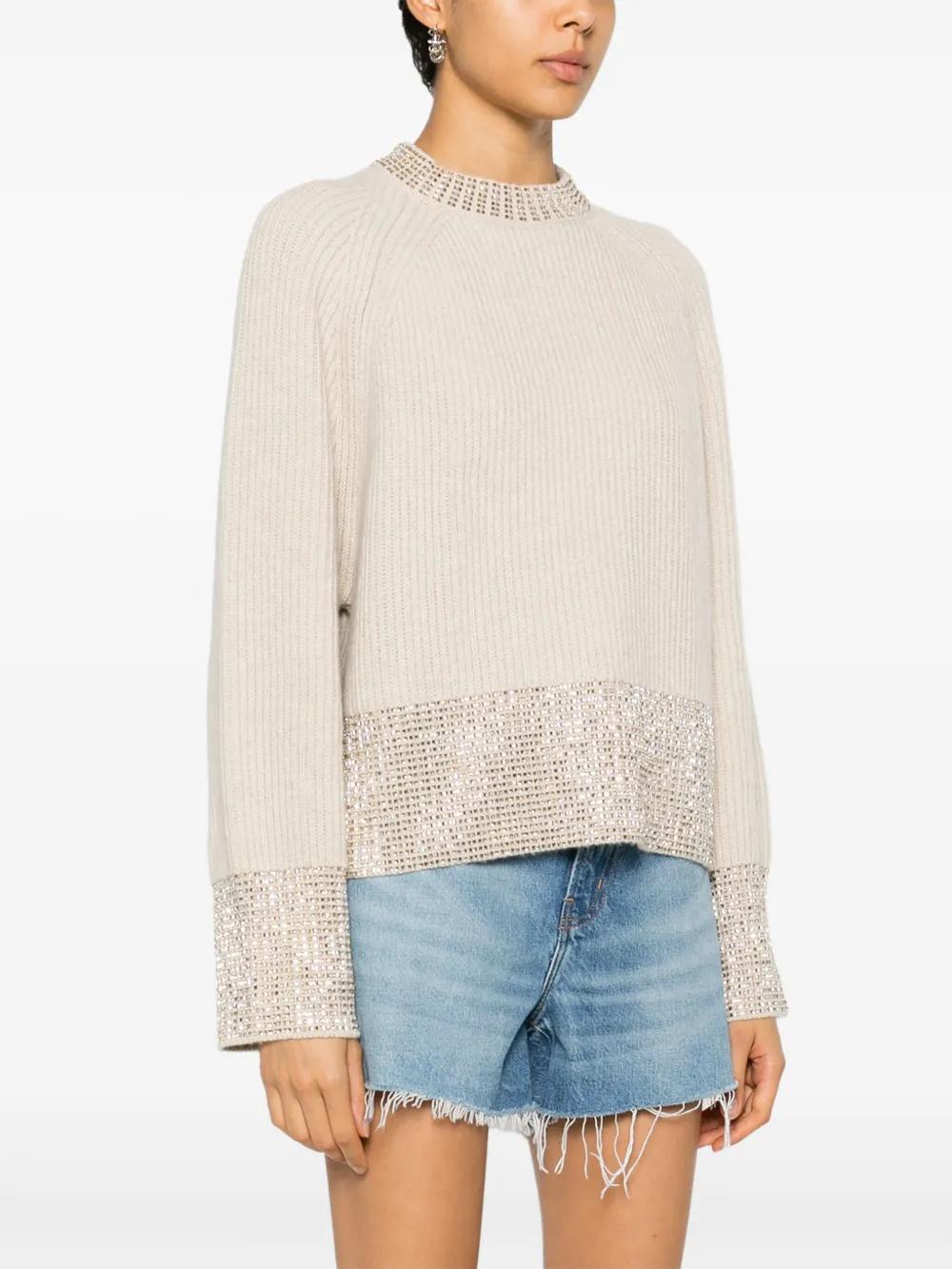 light beige wool ribbed knit mélange effect crystal embellishment crew neck long raglan sleeves straight hem
