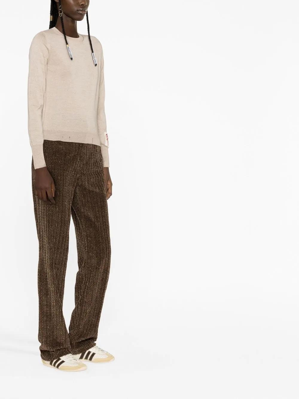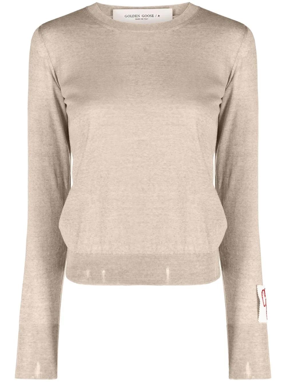 sand beige virgin wool distressed finish logo patch at the sleeve fine knit round neck long sleeves ribbed-knit edge