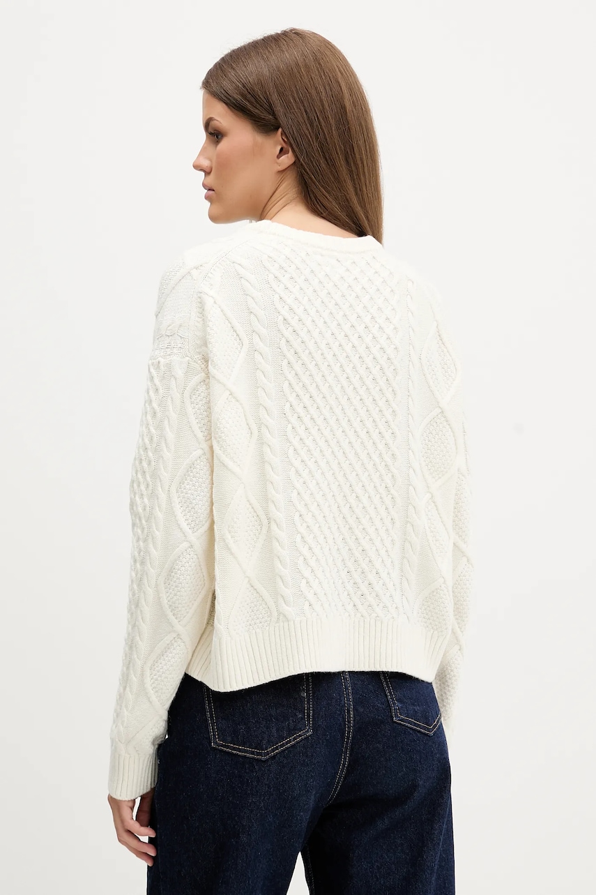 - Sweter w fasonie oversize zapewnia komfort i swobodę ruchów. Pasuje do różnych stylów, podkreślając casualowy charakter stylizacji. - Klasyczny, okrągły dekolt. - Krój rękawa z obniżoną linią ramion nie ogranicza mobilności. - Cienka, elastyczna dzianina. - Rękawy i dolna krawędź wykończone wygodnym, elastycznym ściągaczem. - Długość rękawa(mierzona od dekoltu): 77 cm. - Długość: 57 cm. - Szerokość pod pachami: 61 cm. - Wymiary podane dla rozmiaru: S.