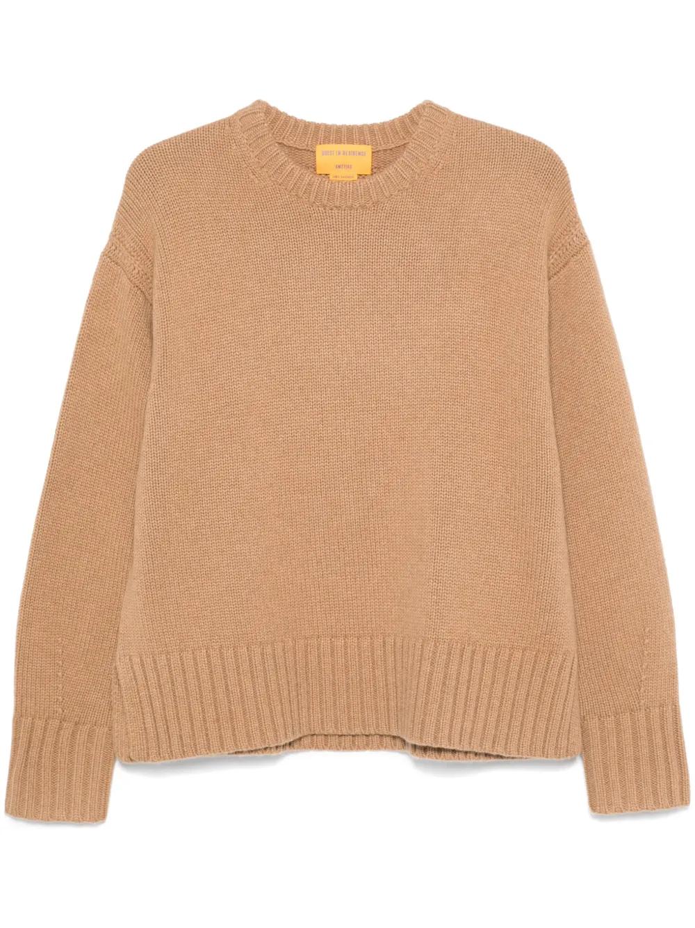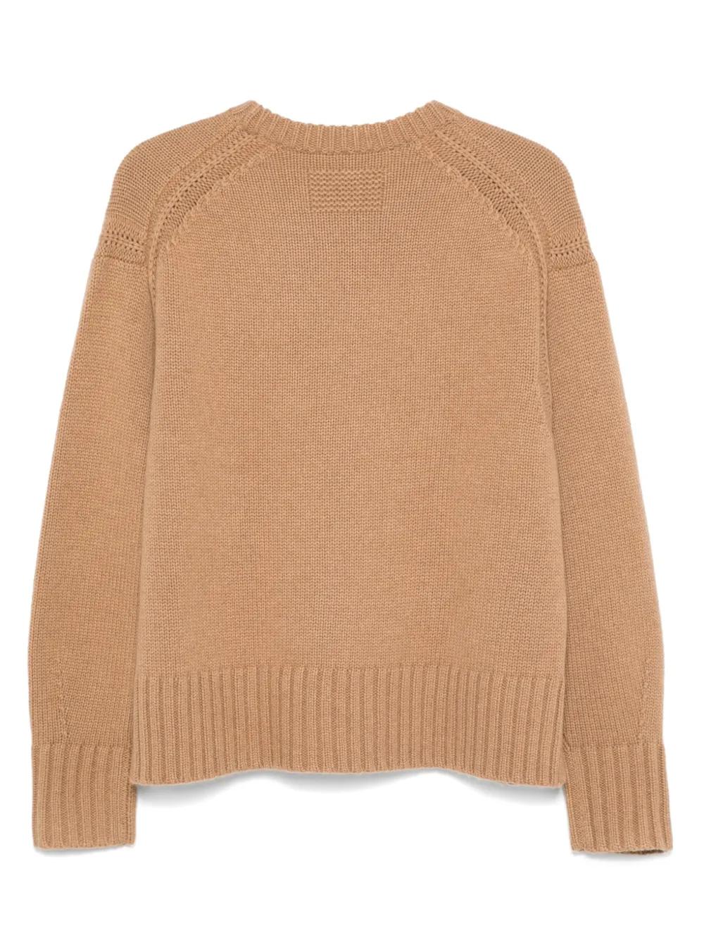 almond beige cashmere ribbed knit crew neck drop shoulder long sleeves side slits straight hem