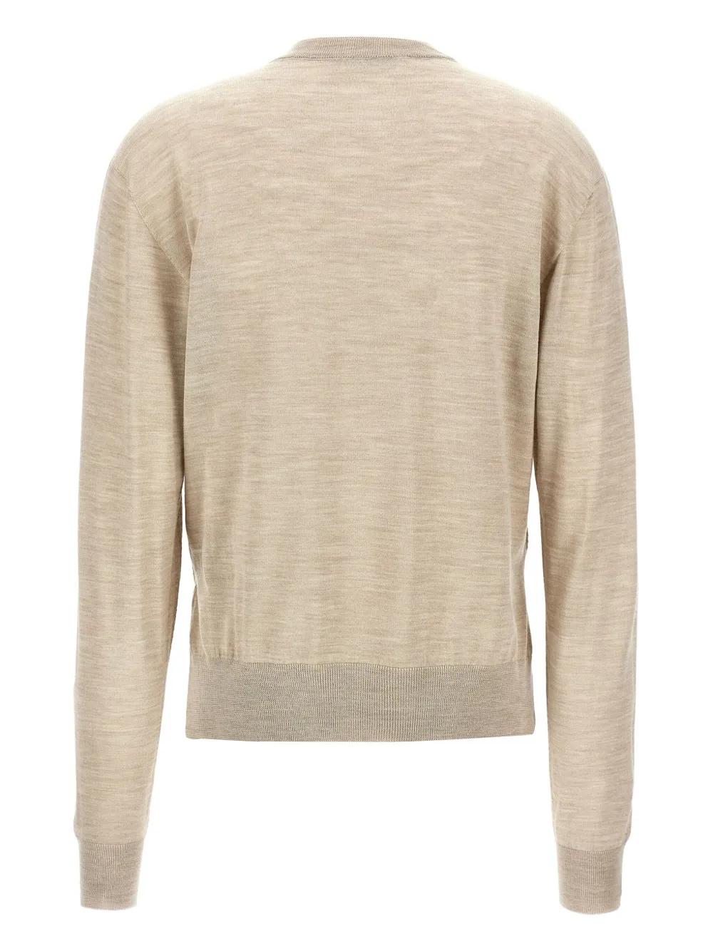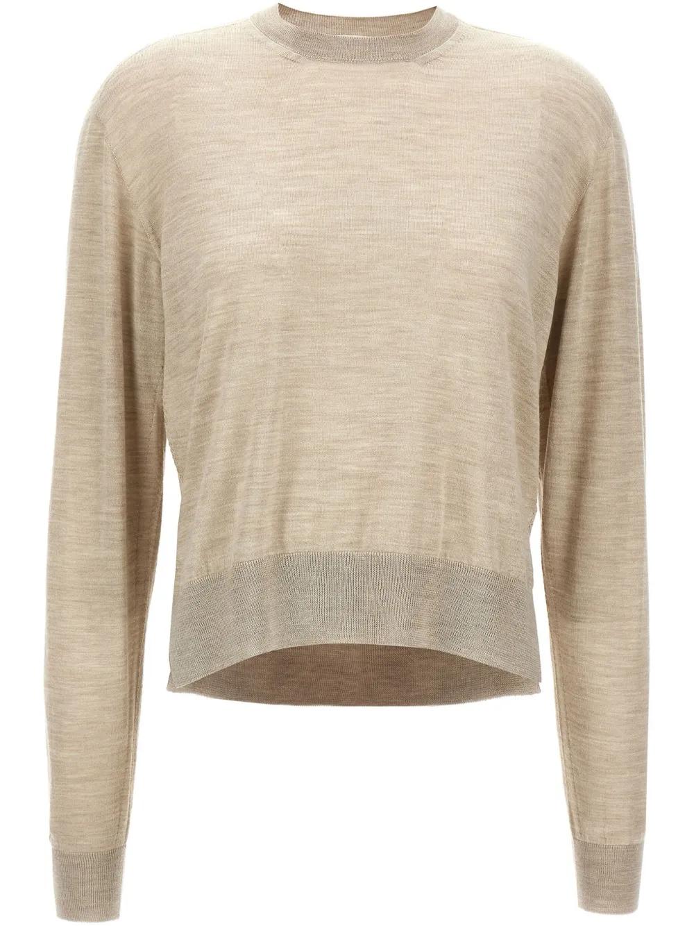 sesame beige short side slits crew neck long sleeves ribbed cuffs and hem