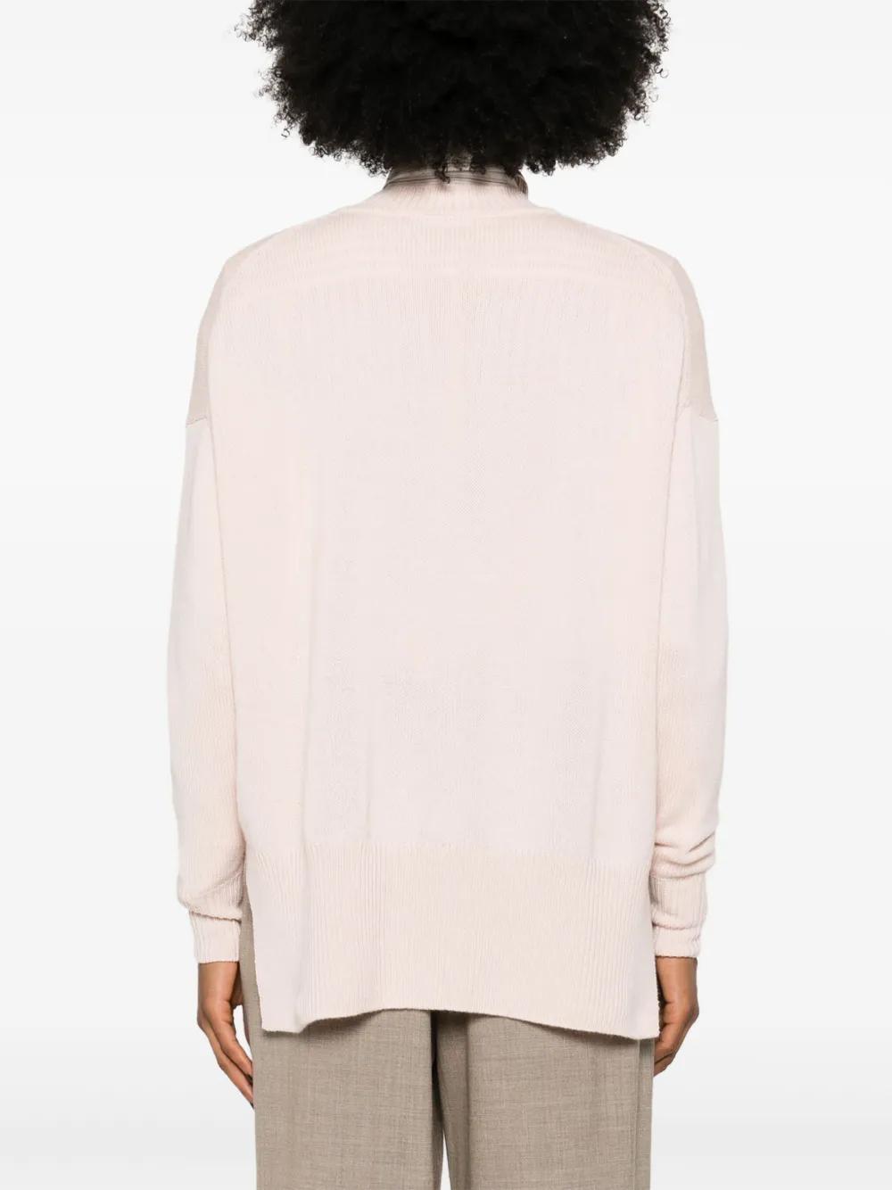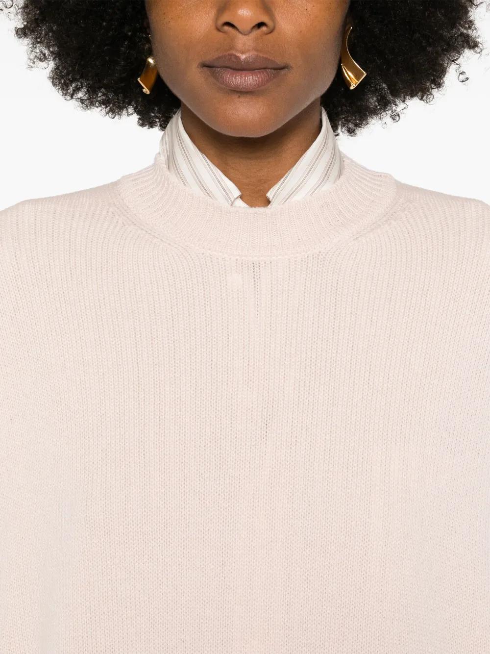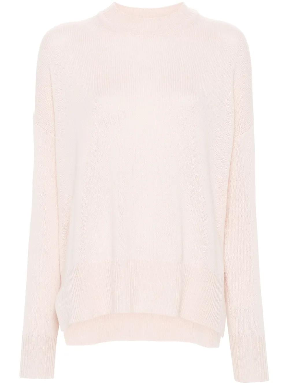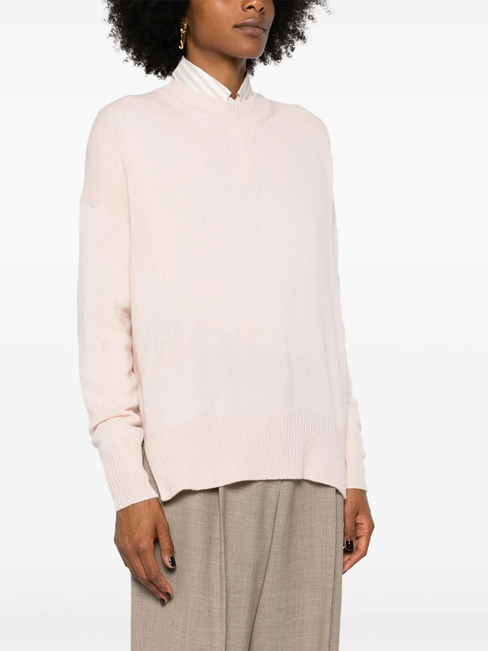 light pink cashmere knitted construction ribbed crew neck drop shoulder long sleeves side slits ribbed cuffs and hem