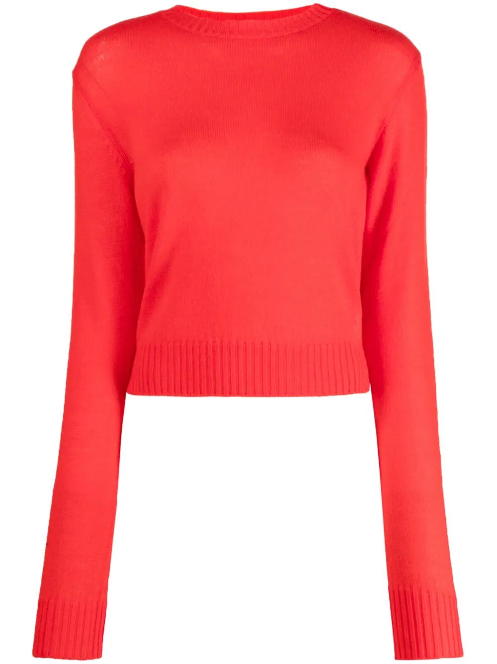 bright red wool knitted construction crew neck long sleeves ribbed cuffs and hem straight hem