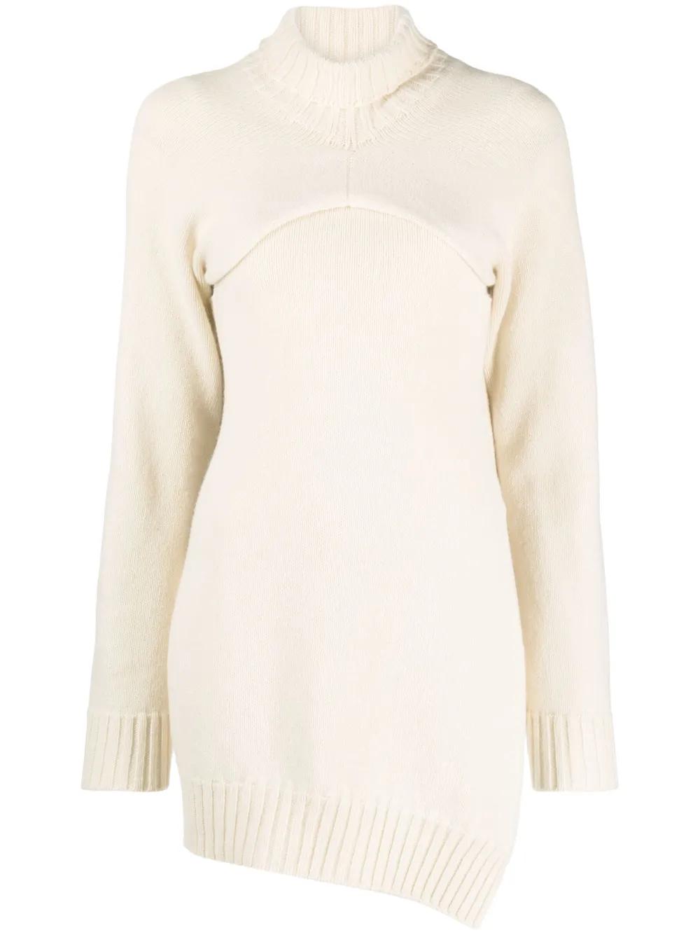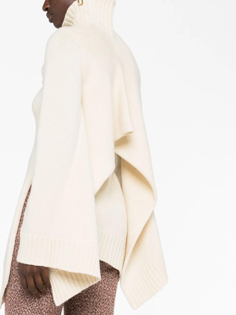 cream white virgin wool blend knitted construction detachable panels high neck draped back long sleeves ribbed cuffs and hem asymmetric hem wide style