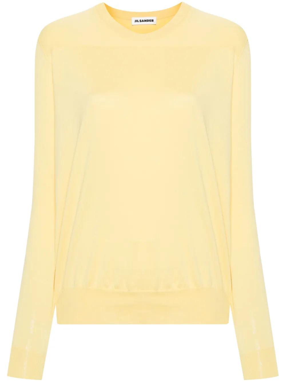 pastel yellow cotton knitted construction fine knit panelled design crew neck drop shoulder long sleeves ribbed cuffs and hem straight hem