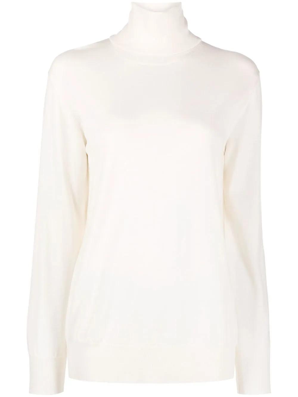 ivory white wool knitted construction roll neck ribbed band collar long sleeves ribbed cuffs