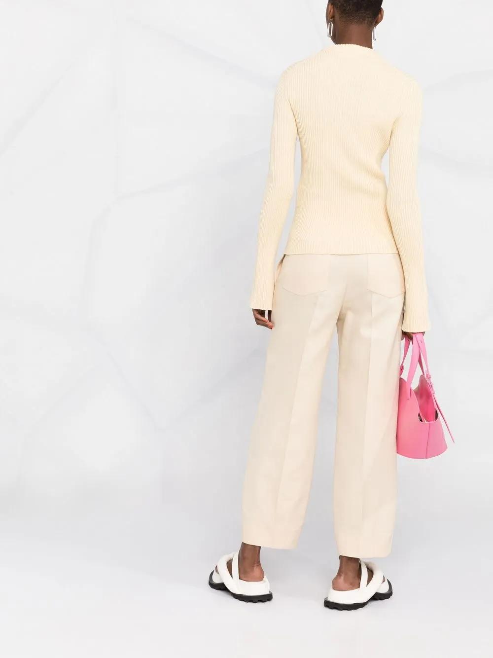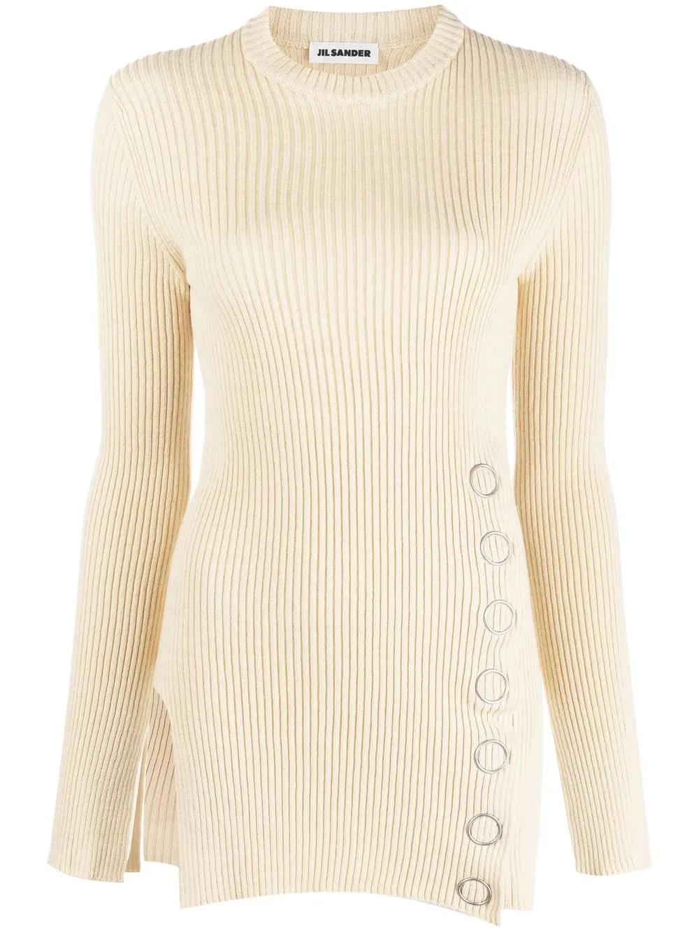 light beige linen-wool blend ribbed knit side press-stud fastening crew neck long sleeves split cuffs side slit