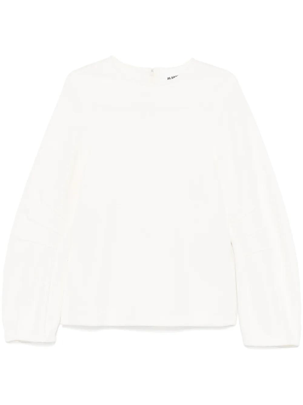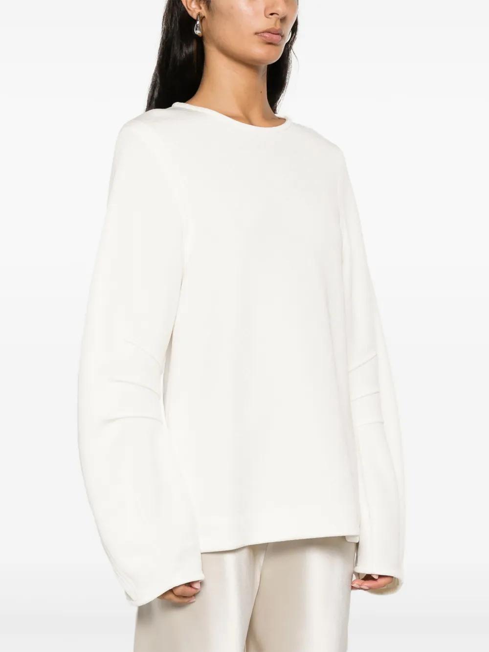 white textured finish concealed rear hook and zip fastening round neck long sleeves raised seam detail side slits straight hem