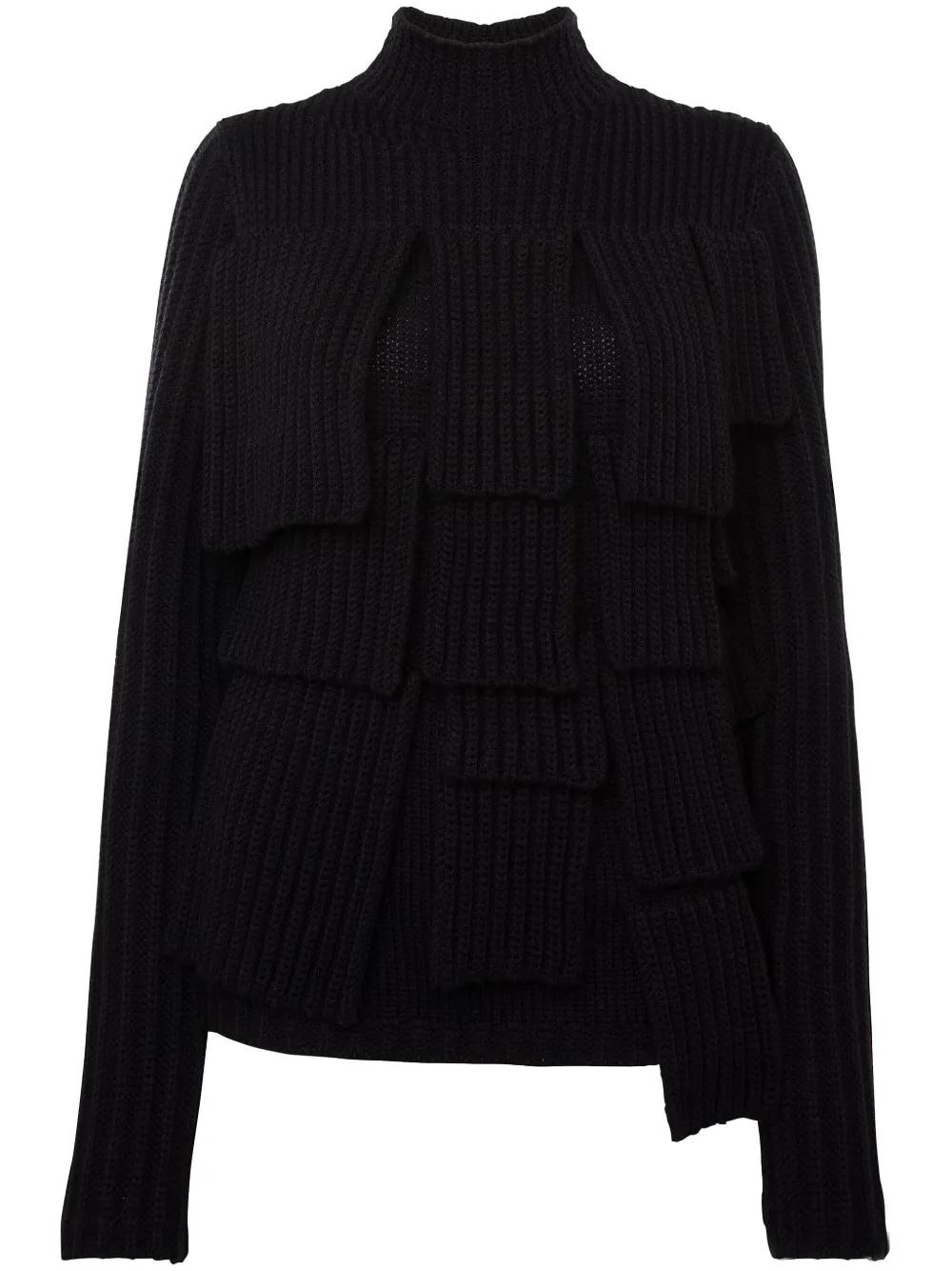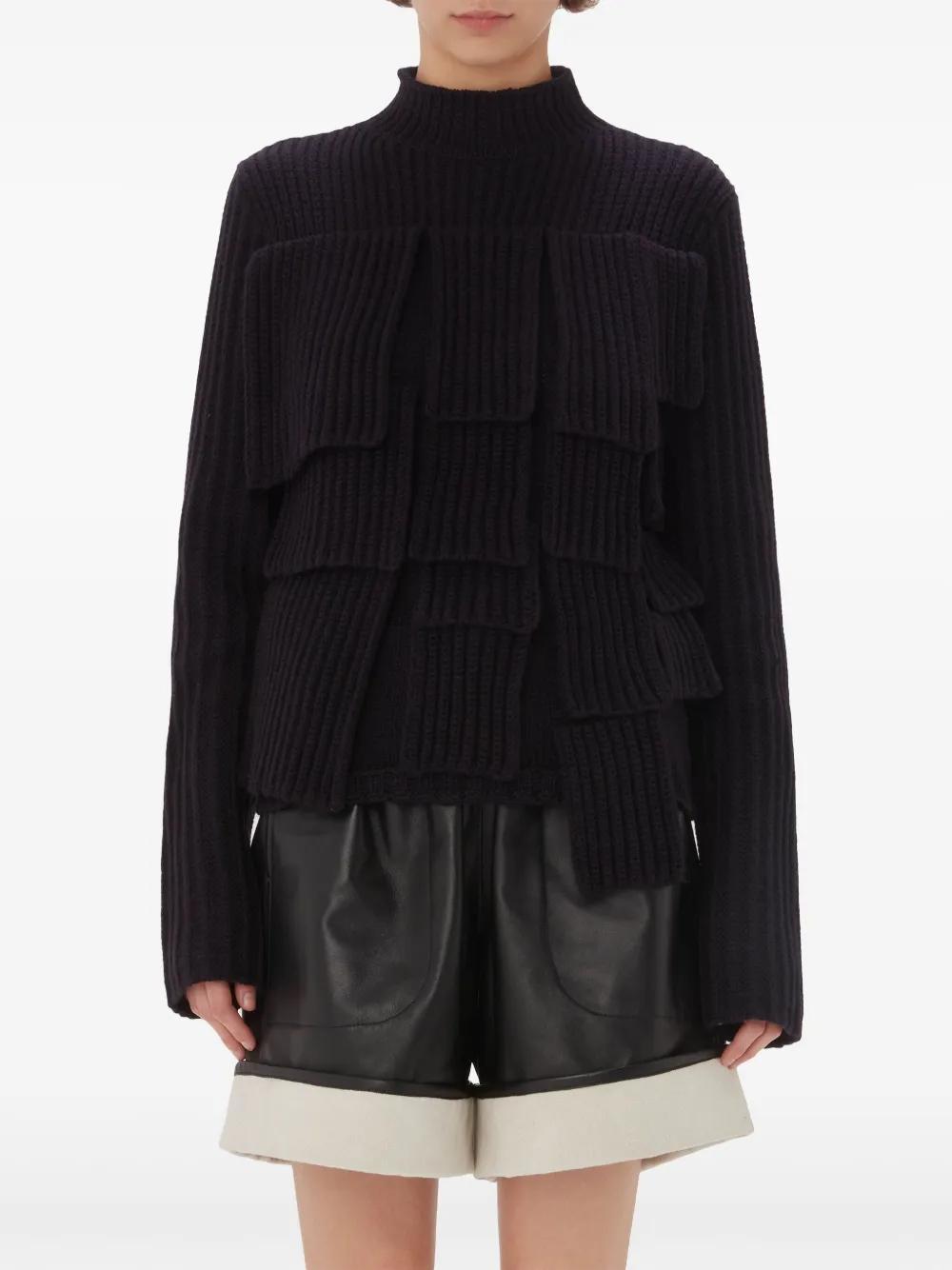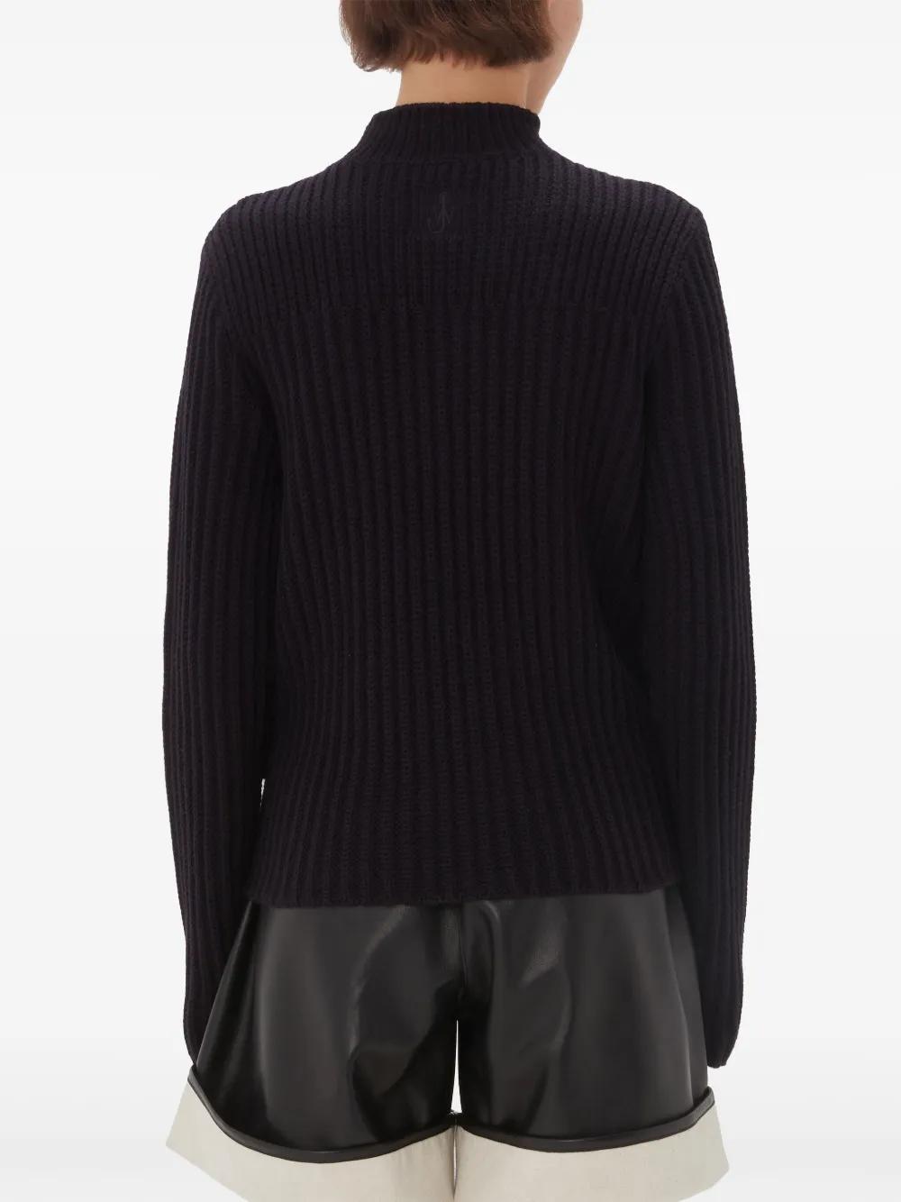 navy blue wool blend ribbed knit asymmetric design high neck long sleeves straight hem