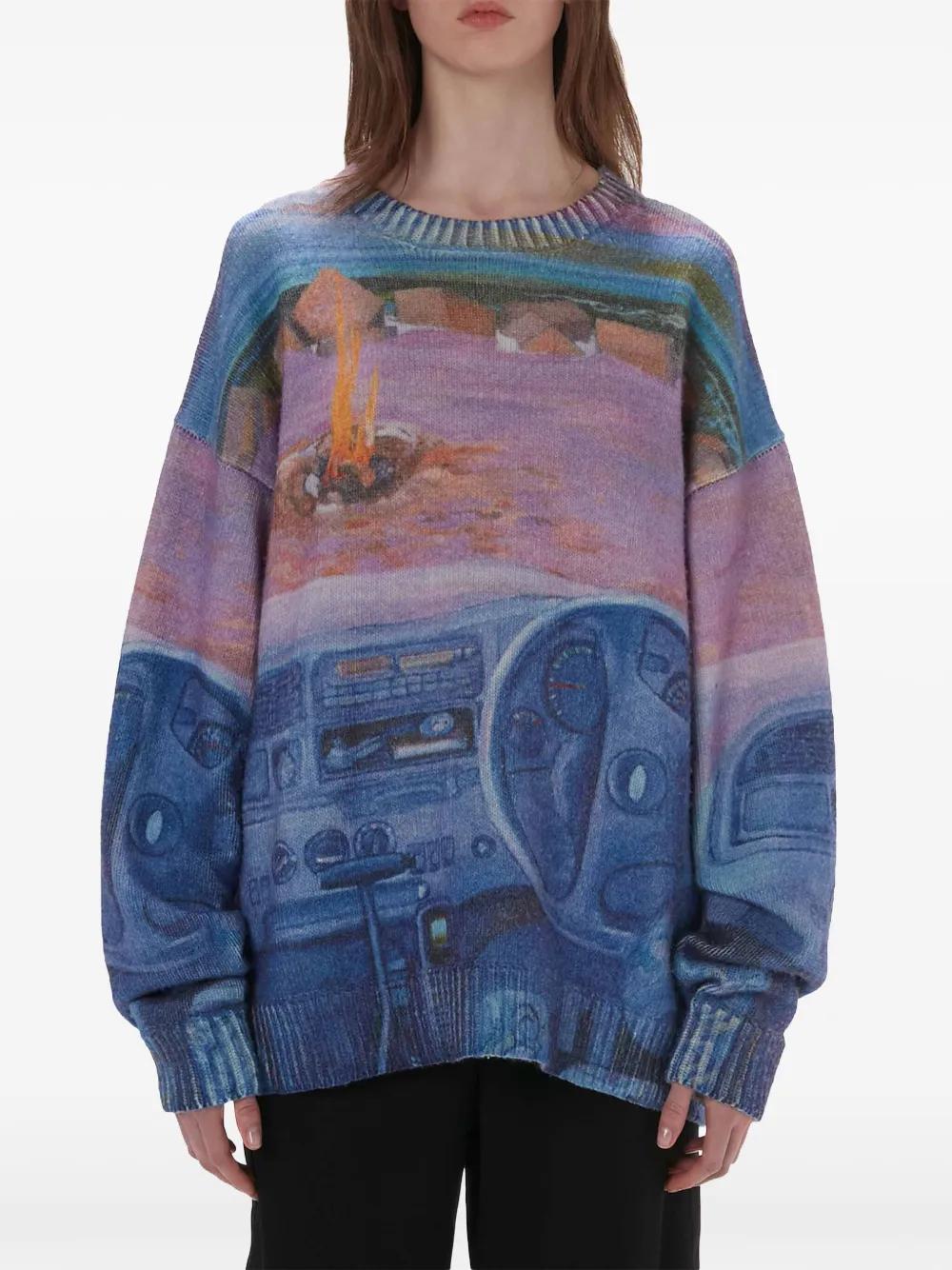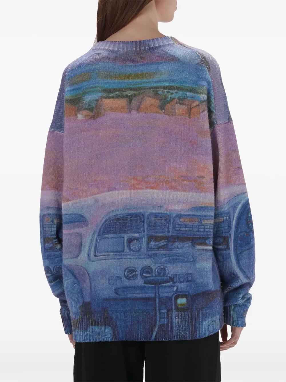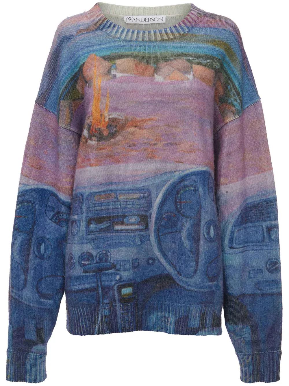 navy blue/multicolour wool blend fine knit all-over graphic print signature JW-initials anchor logo ribbed trim crew neck drop shoulder long sleeves straight hem