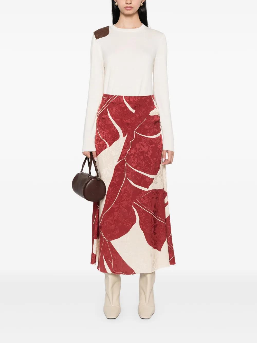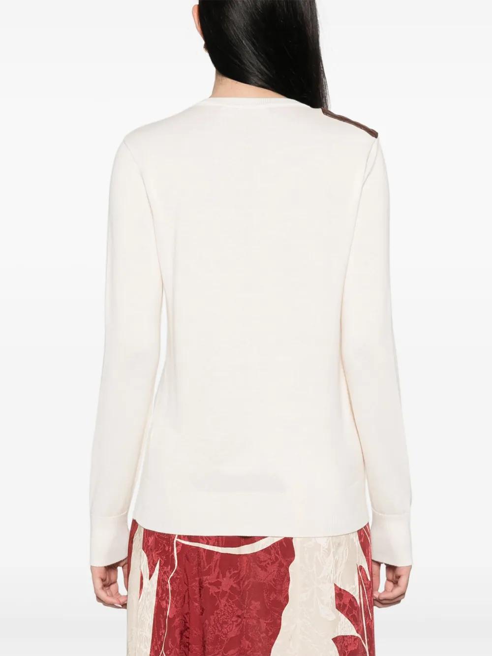 ecru cotton blend fine knit ribbed trim crew neck quilted shoulder pad long sleeves straight hem