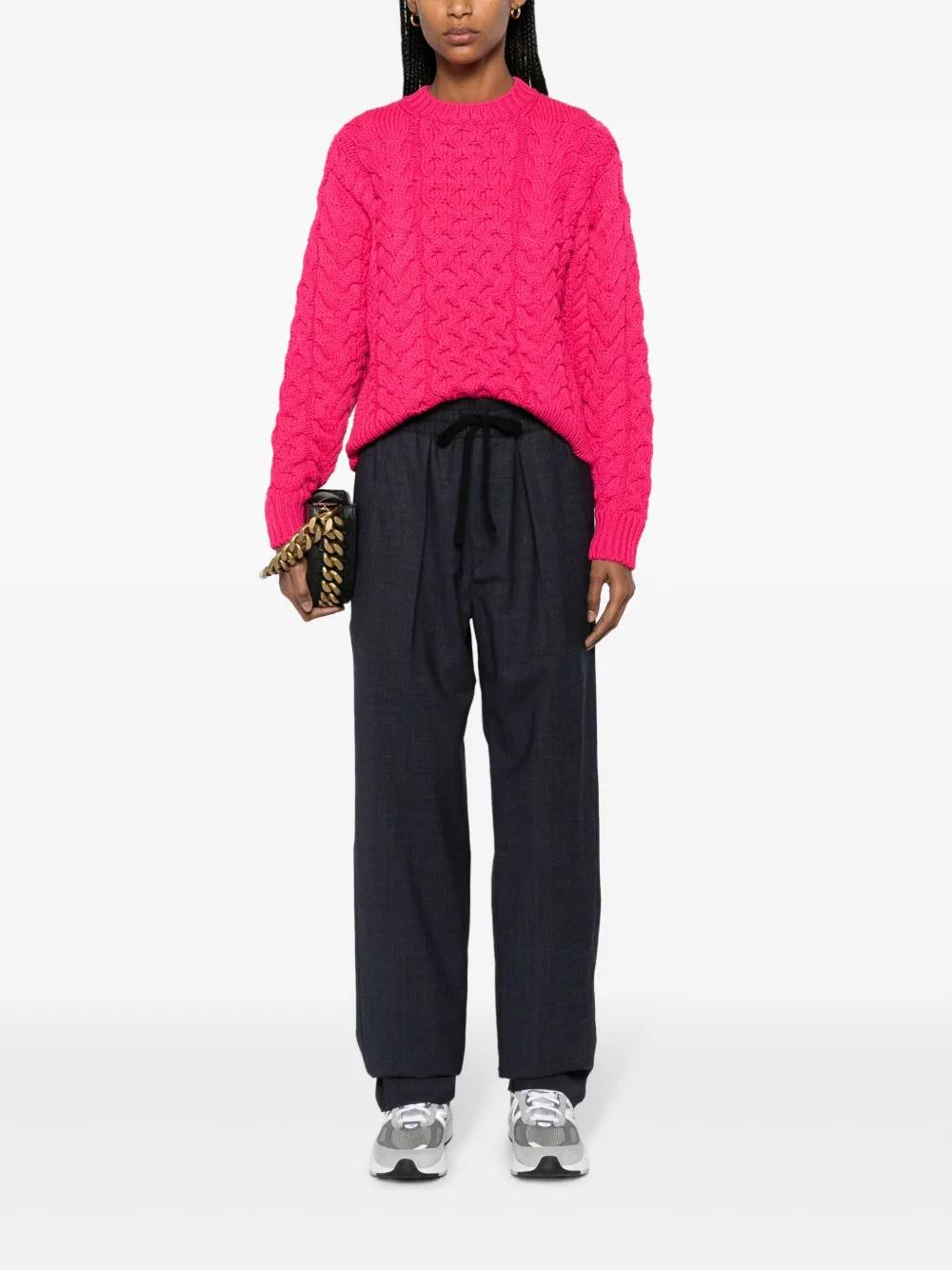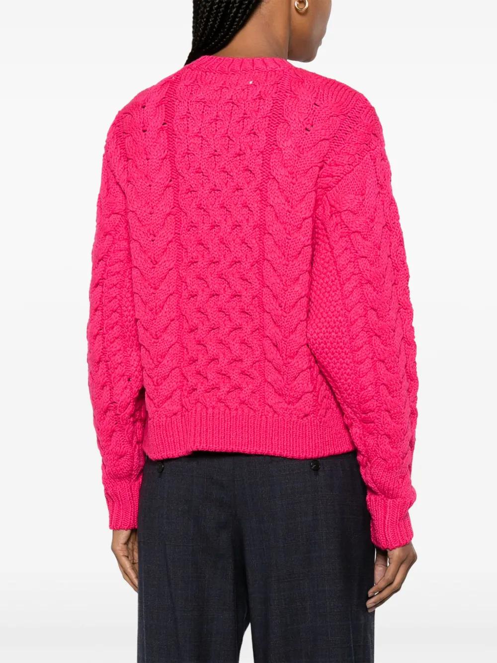 fuchsia pink chunky cable knit open knit ribbed-knit edge crew neck drop shoulder long sleeves straight hem
