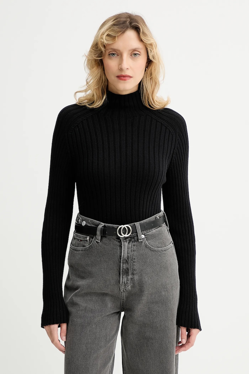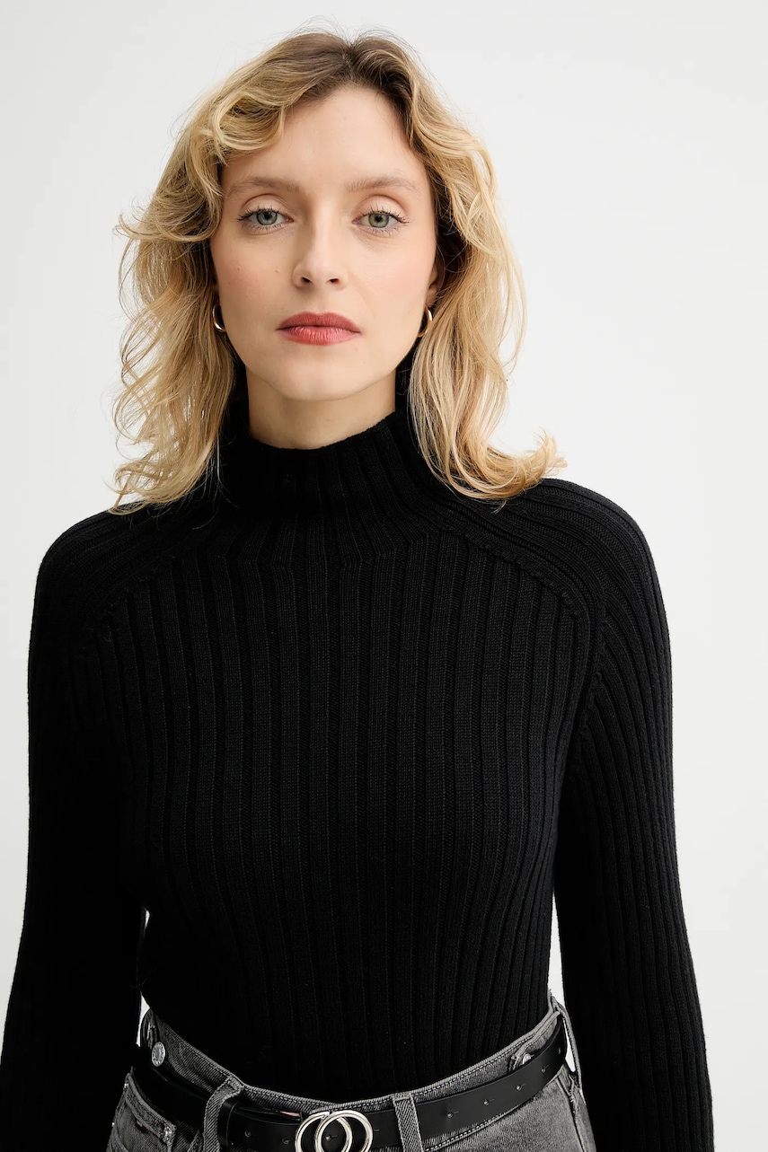 - Dopasowany, podkreślający sylwetkę fason. - Model z golfem. - Długi, raglanowy rękaw. - Prążkowana struktura materiału sprawia, że jest on niezwykle elastyczny i doskonale przylega do ciała. - Długość rękawa(mierzona od dekoltu): 77 cm. - Długość: 56 cm. - Szerokość pod pachami: 35 cm. - Wymiary podane dla rozmiaru: S.