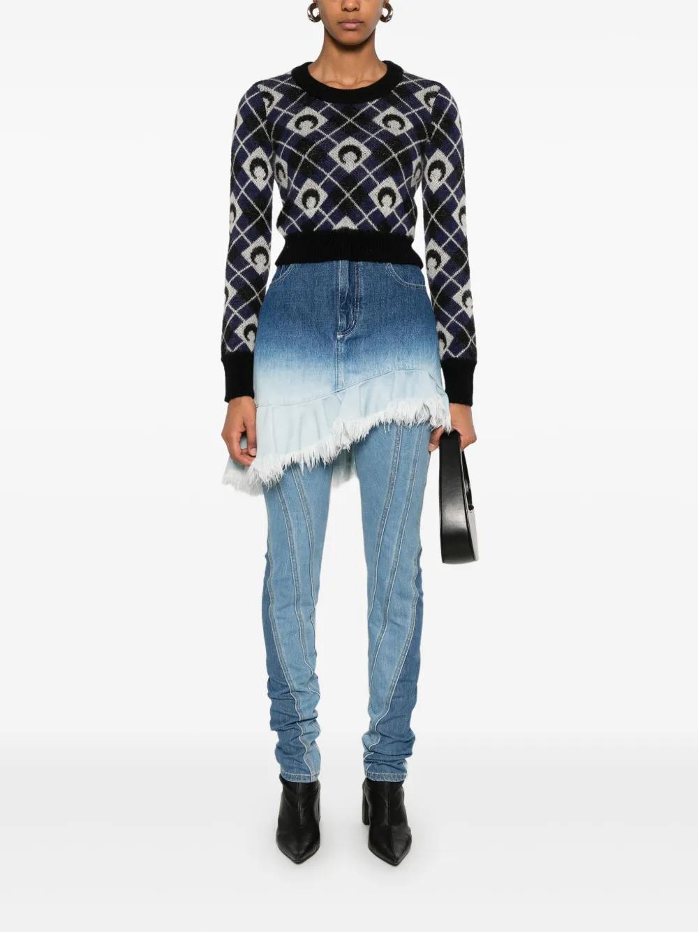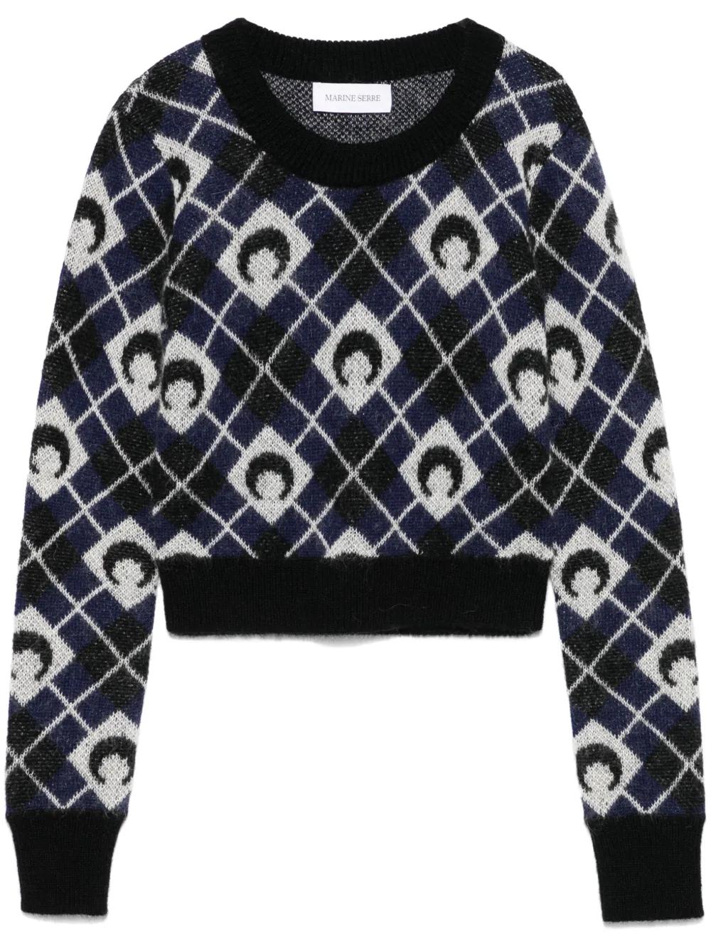 black/white/navy blue mohair blend knitted construction brushed effect argyle check pattern Moon jacquard ribbed crew neck long sleeves logo patch to the rear ribbed cuffs and hem cropped