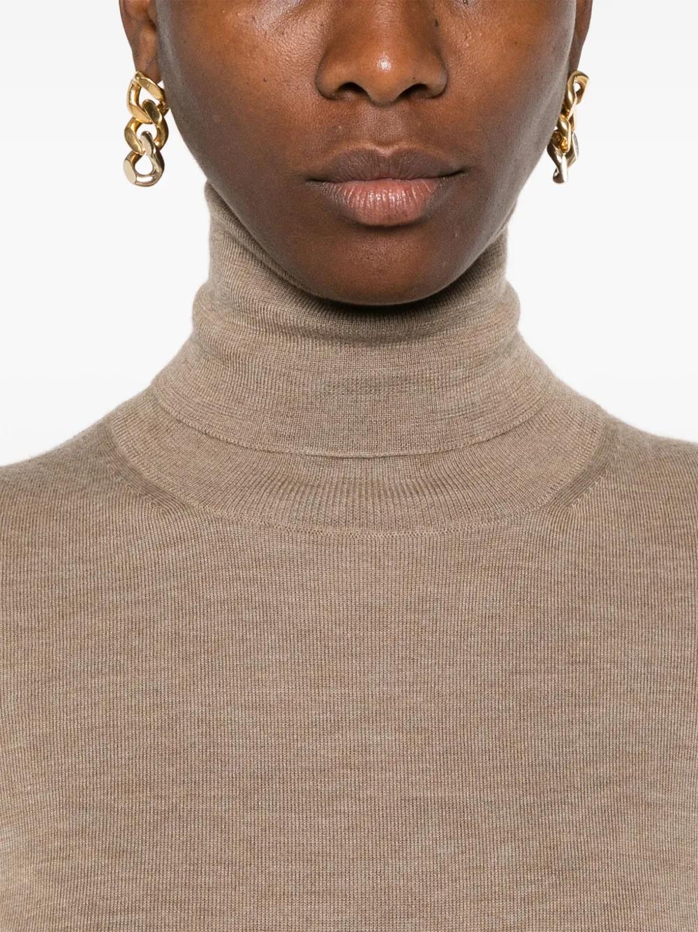 light brown cashmere fine knit roll neck long sleeves ribbed trim straight hem