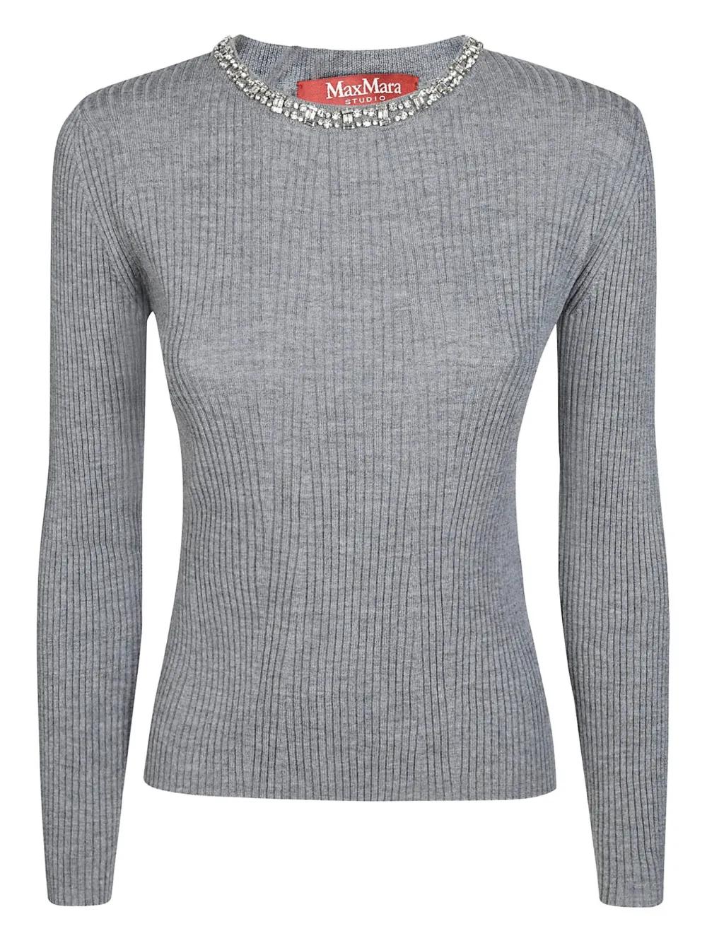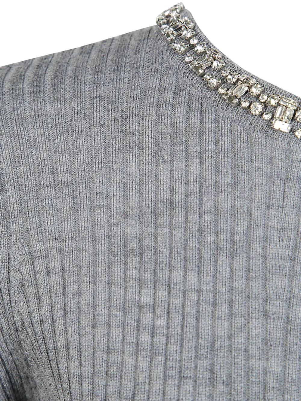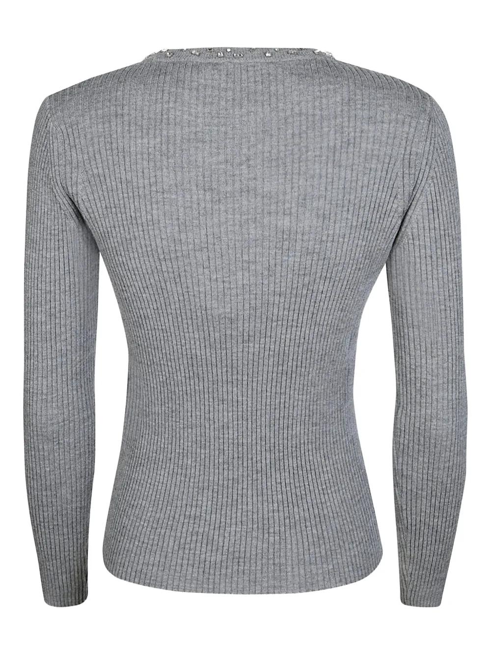 medium grey ribbed knit rhinestone embellishment round neck long sleeves