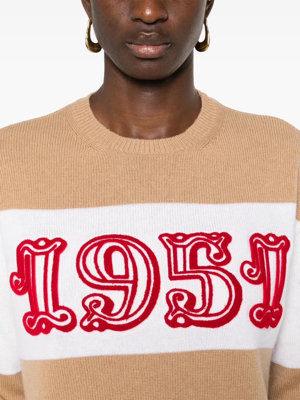 light brown/milk white wool-cashmere blend knitted construction horizontal stripe pattern ribbed crew neck long sleeves in patterned intarsia knit flocked 1951 motif to the front ribbed cuffs and hem