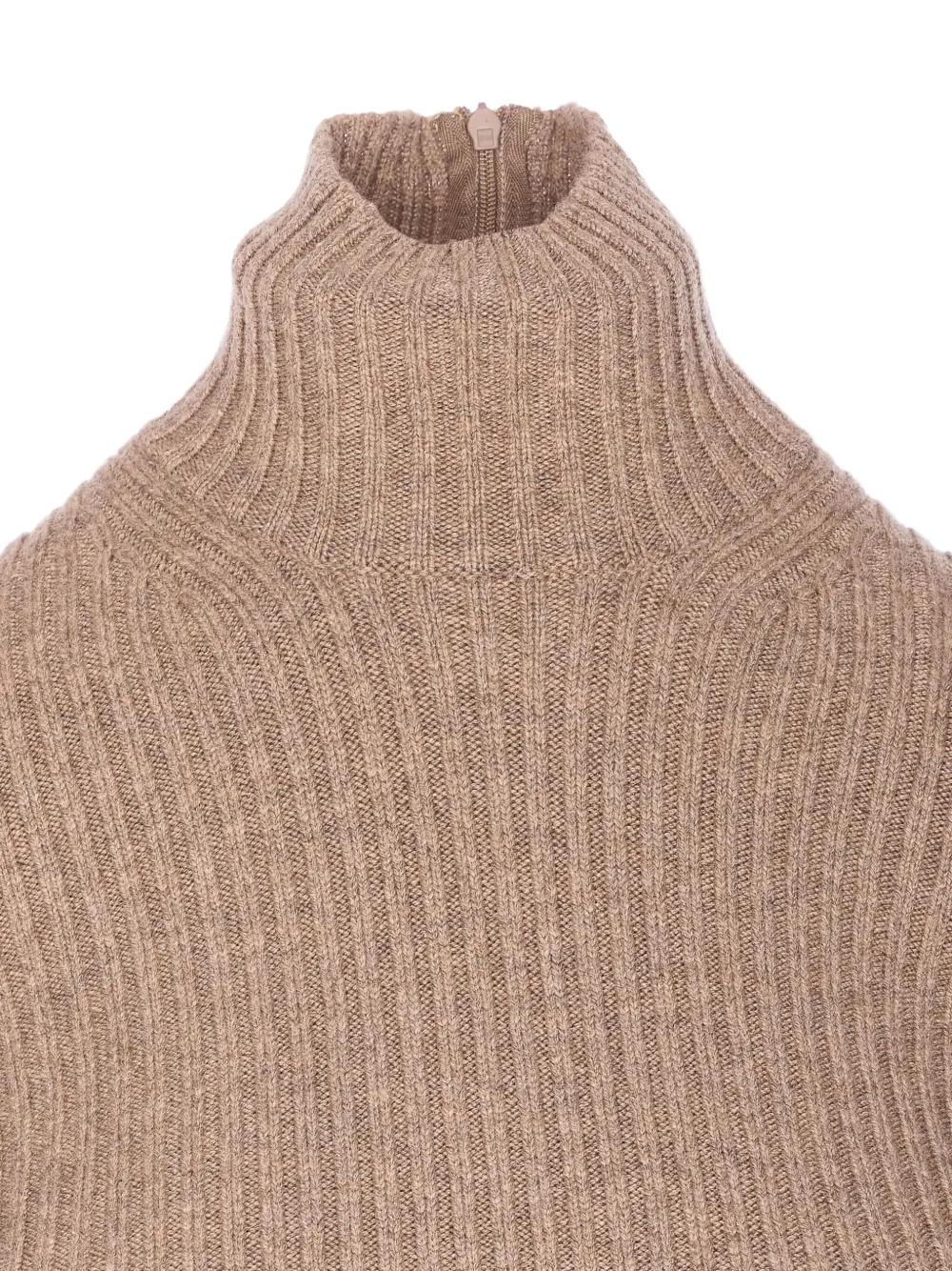 beige ribbed knit high neck long sleeves back zip closure