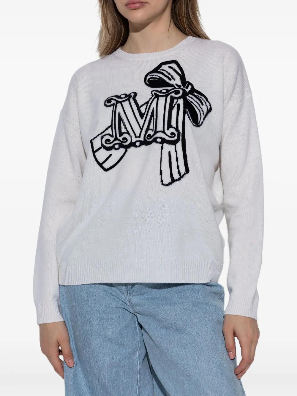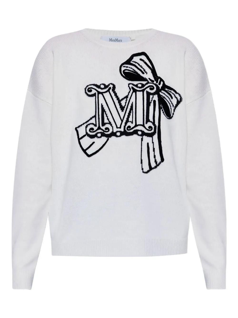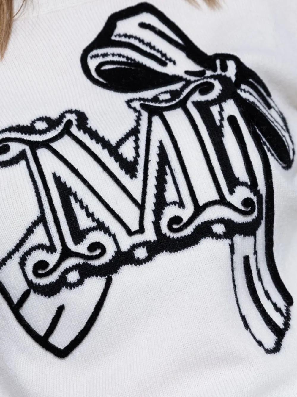 white bold monogram pattern oversized bow detail round neck long sleeves