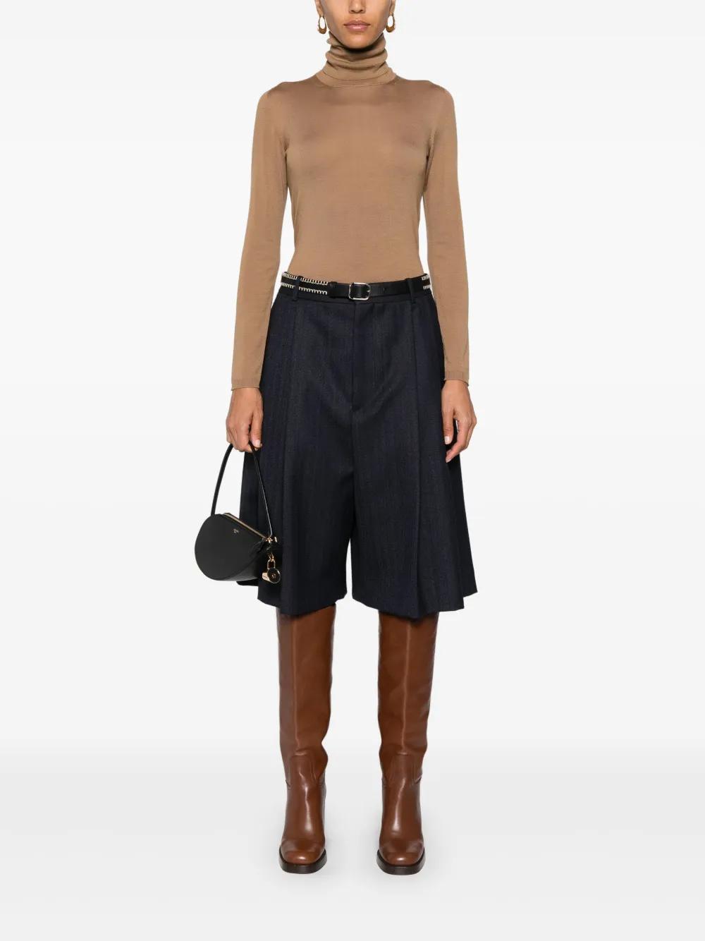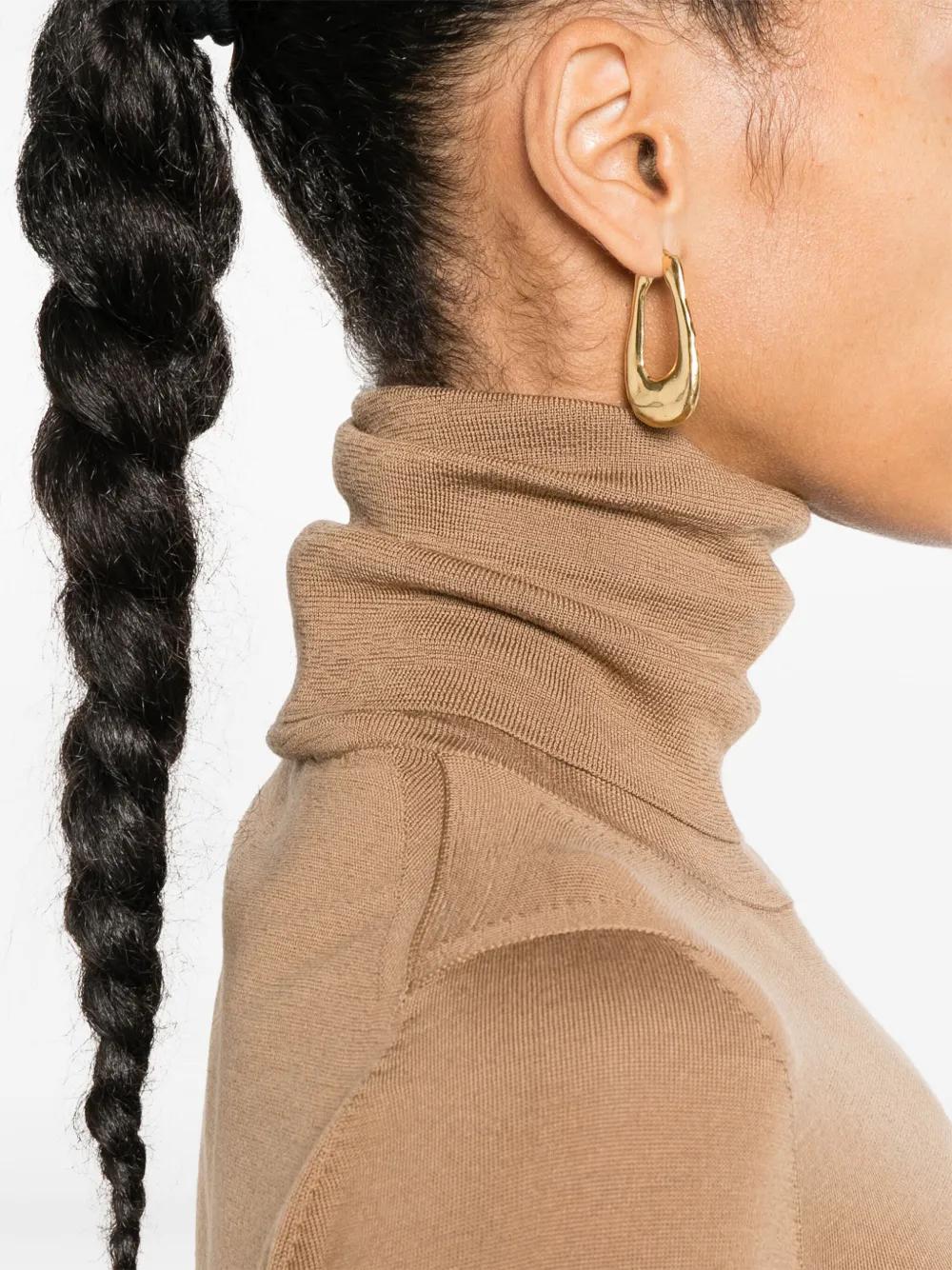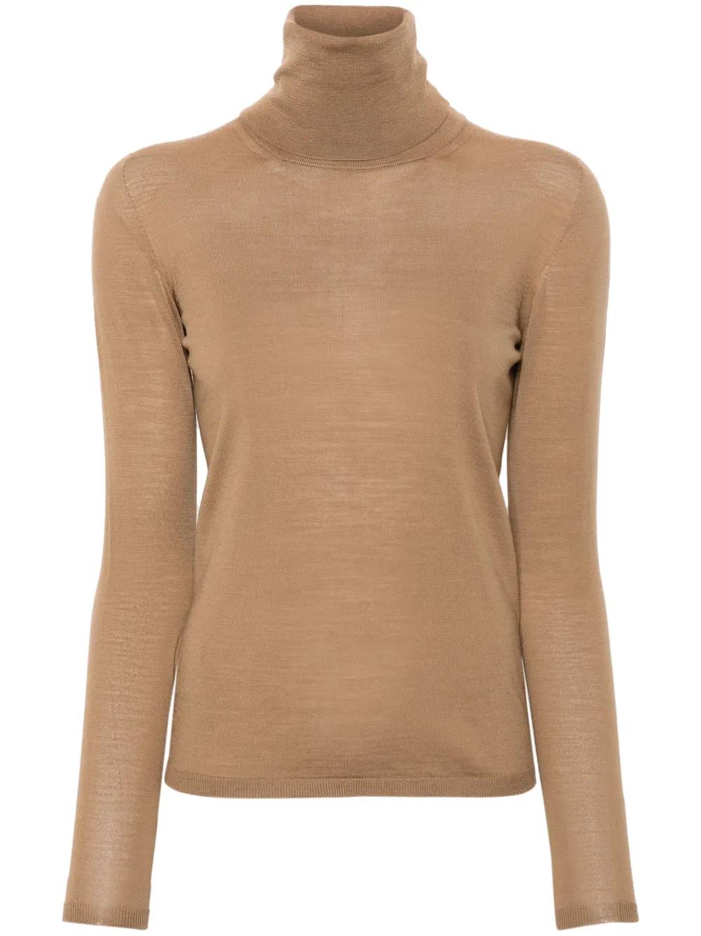 camel brown virgin wool knitted construction fine knit roll neck long sleeves ribbed cuffs and hem straight hem