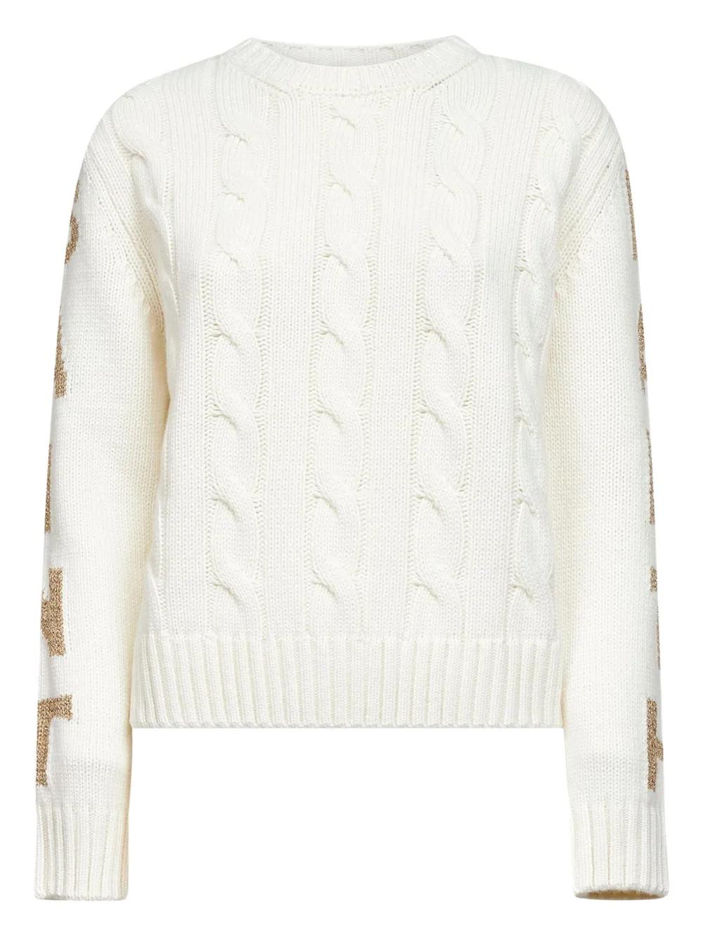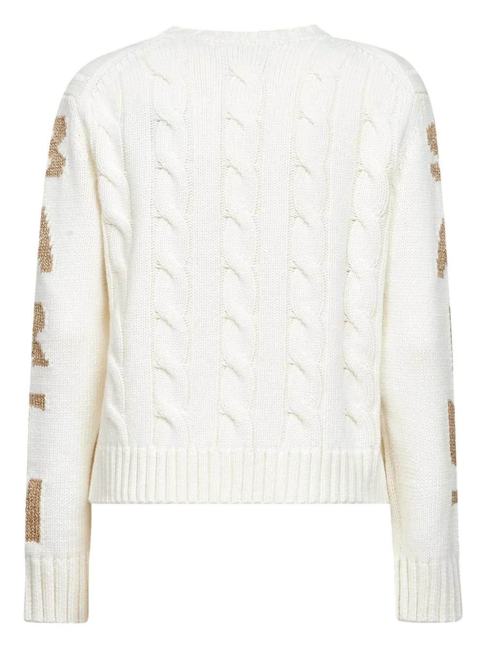ivory ribbed crewneck lettering at sleeves ribbed cuffs ribbed hem cable-knit design