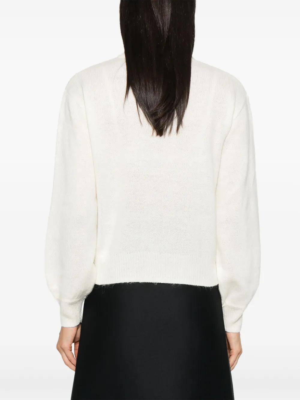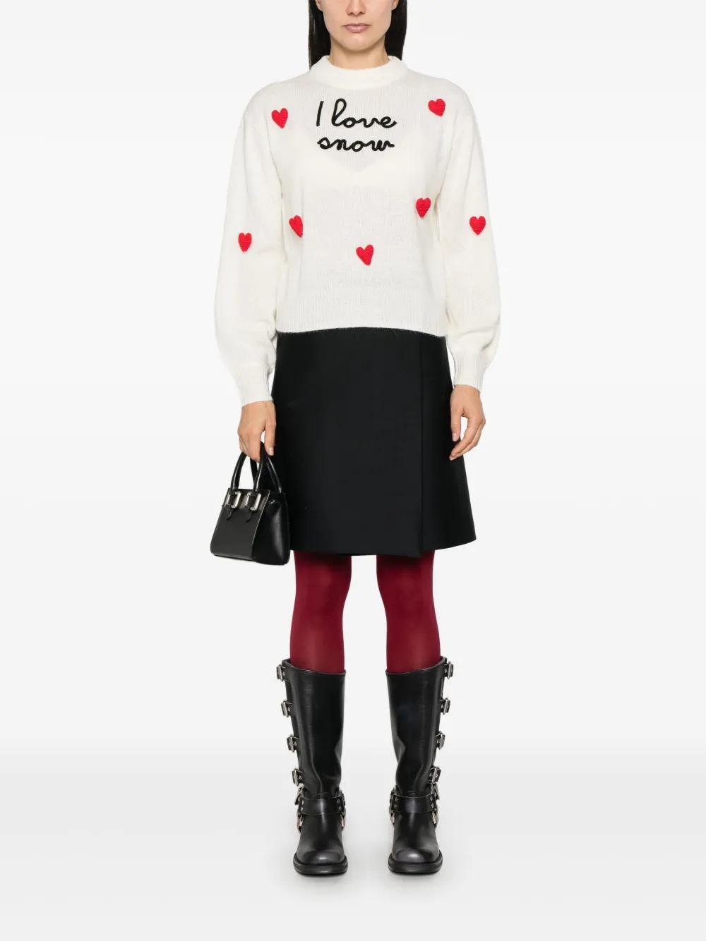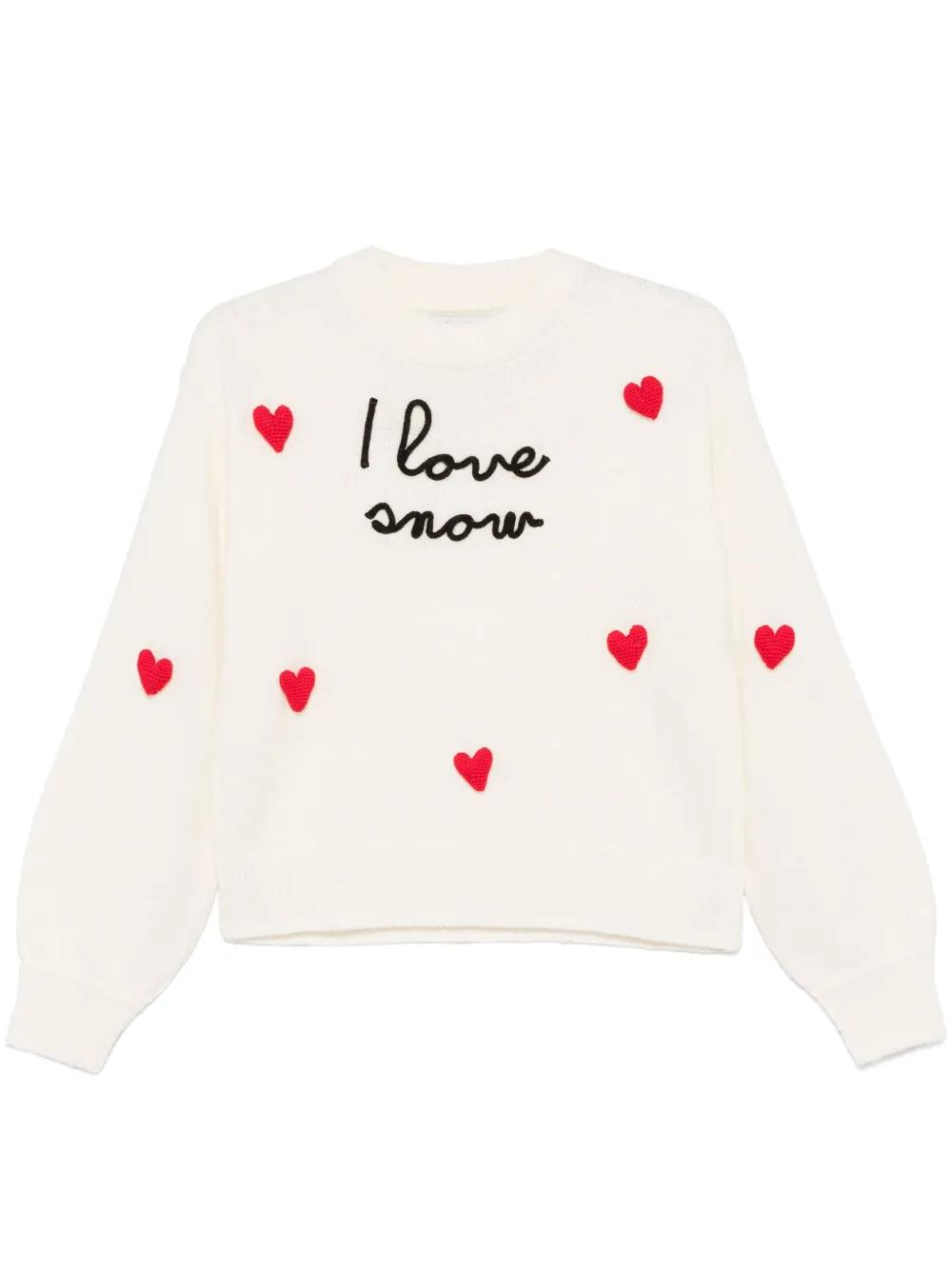 white knitted construction ribbed crew neck heart appliqué detail long sleeves embroidered logo at the sleeve embroidered 'I Love Snow' to the front ribbed cuffs and hem