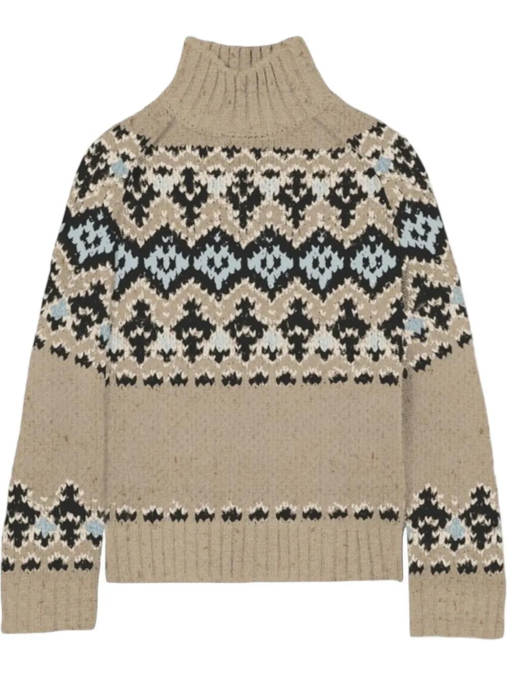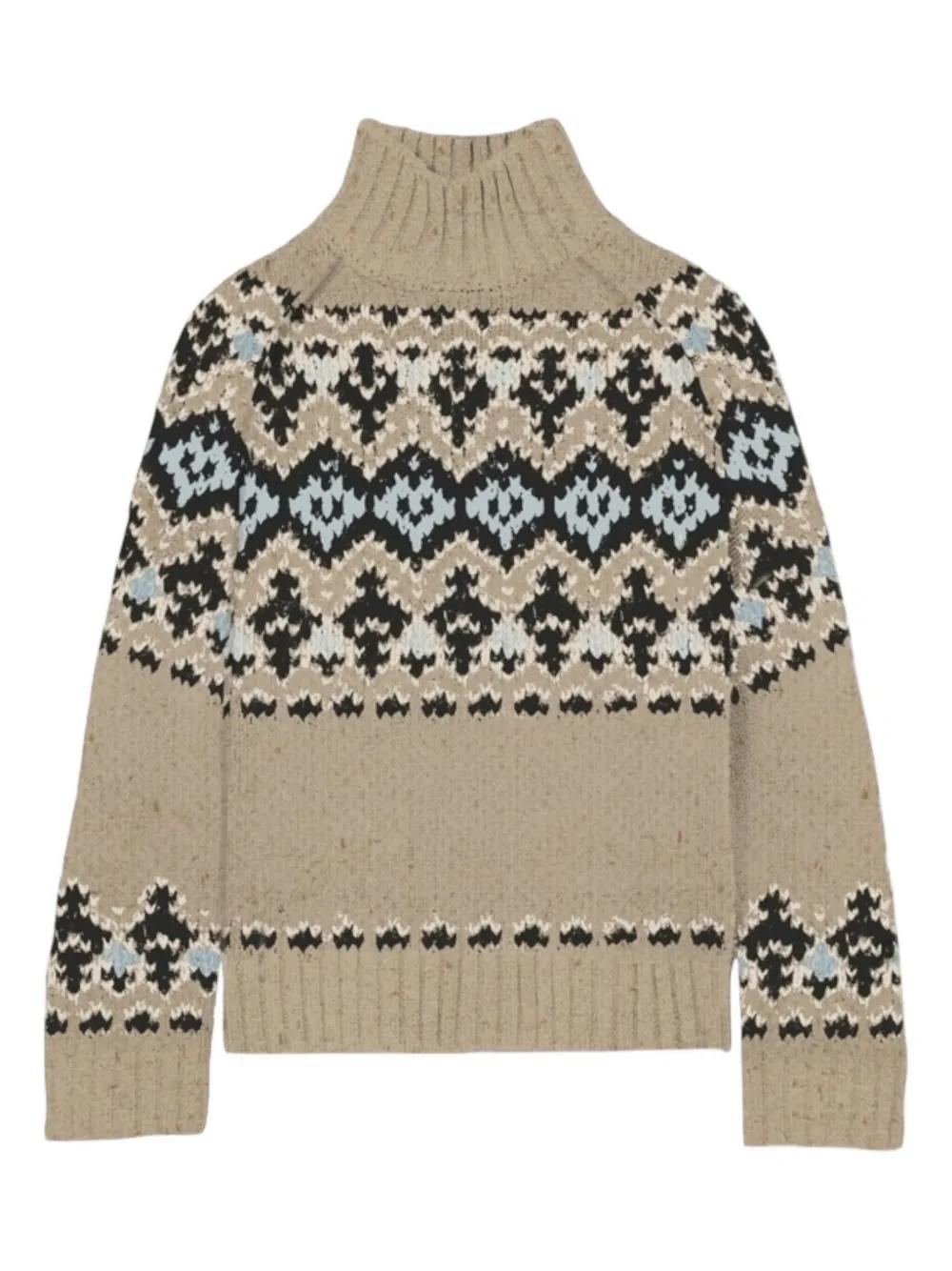 light brown fair isle pattern roll neck long sleeves ribbed cuffs and hem