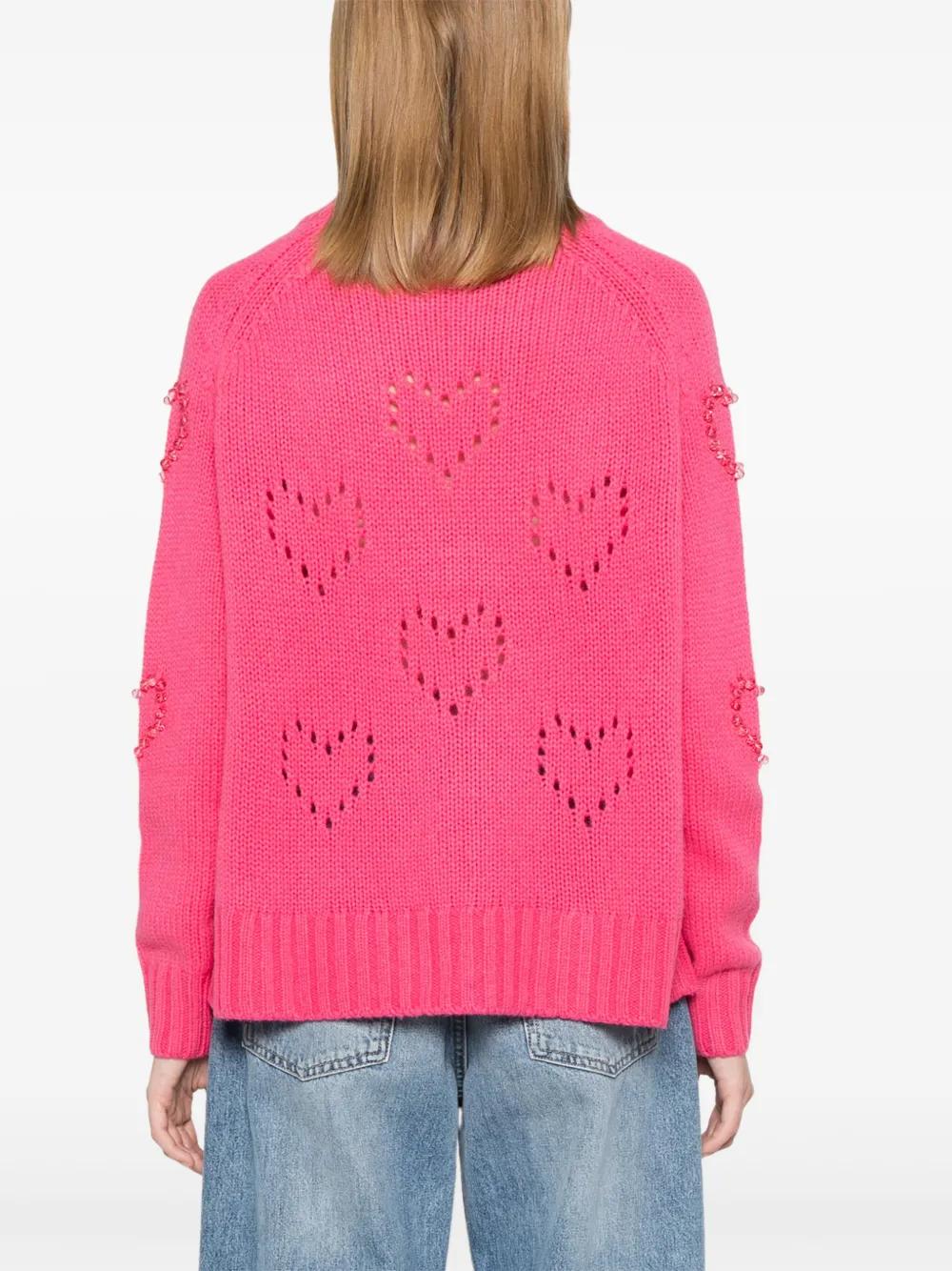 pink wool blend knitted construction pointelle knit ribbed trim high neck long raglan sleeves heart motif bead detailing straight hem