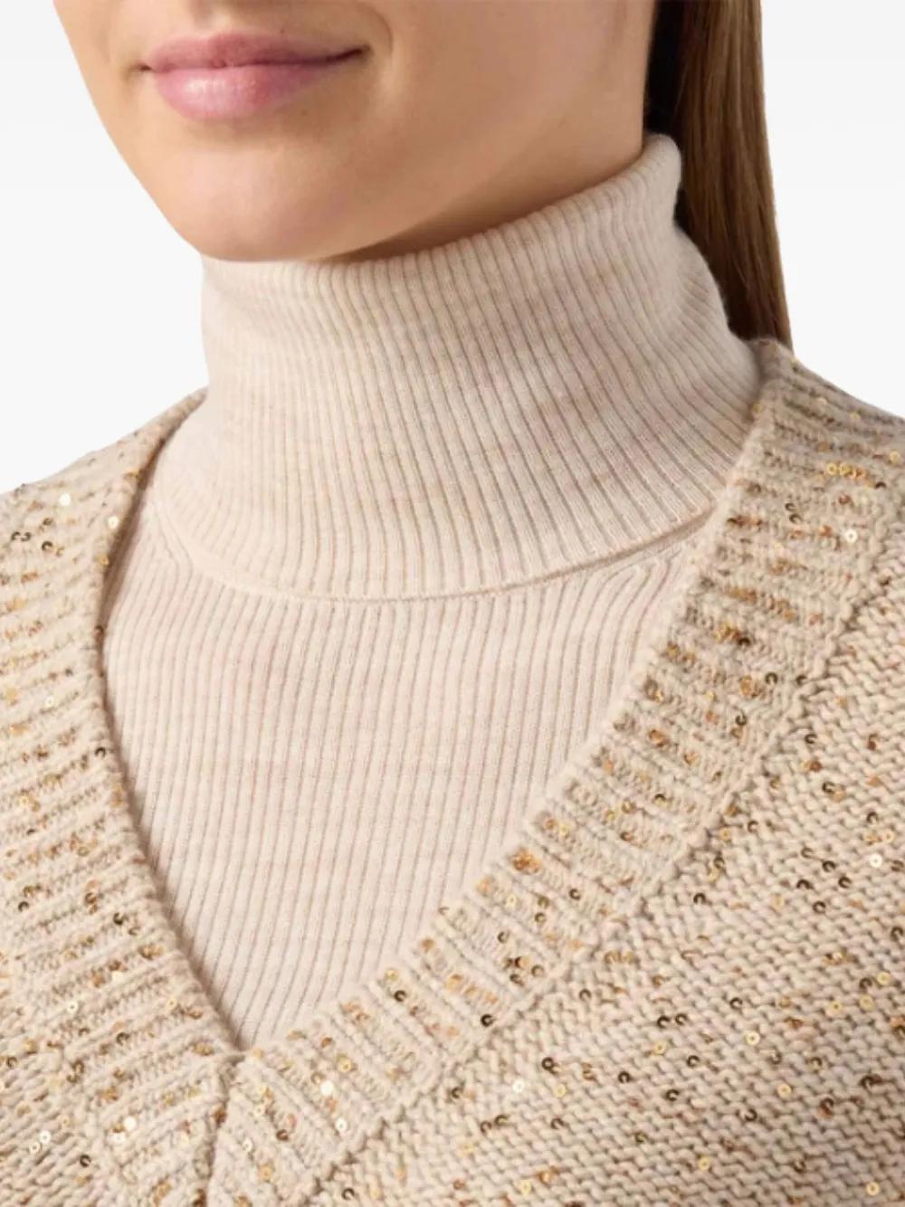 brown sequin embellishment v-neck ribbed knit long sleeves ribbed hem