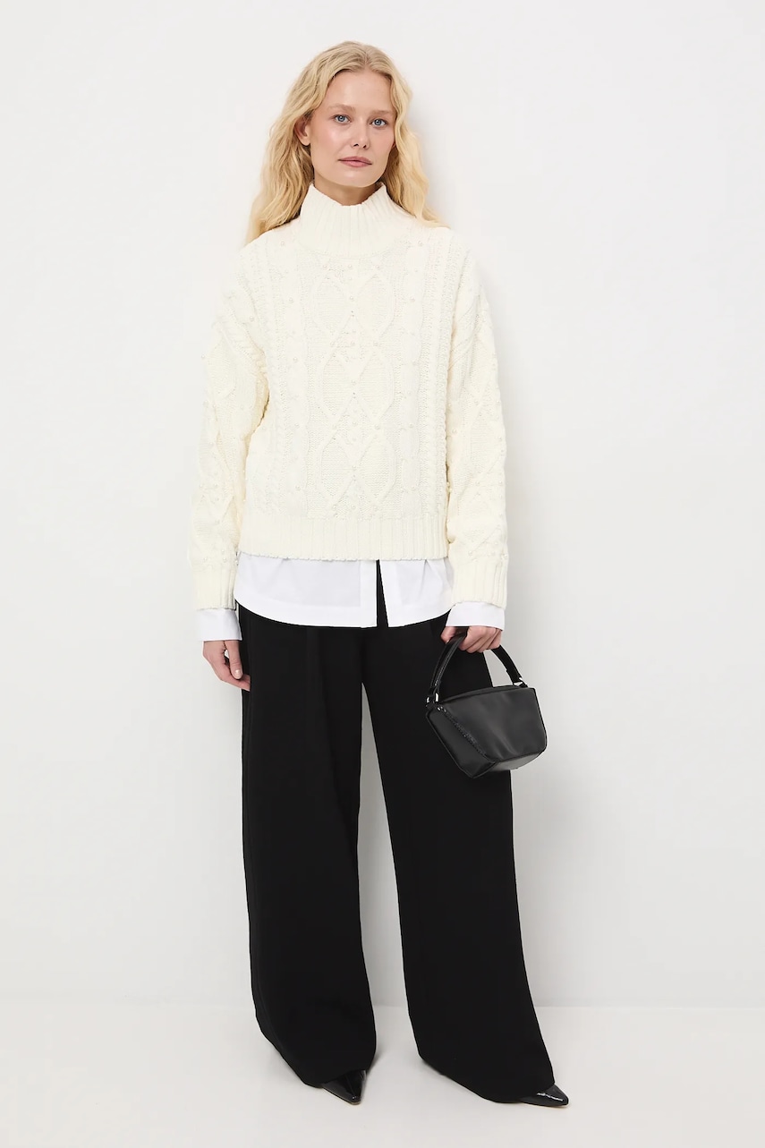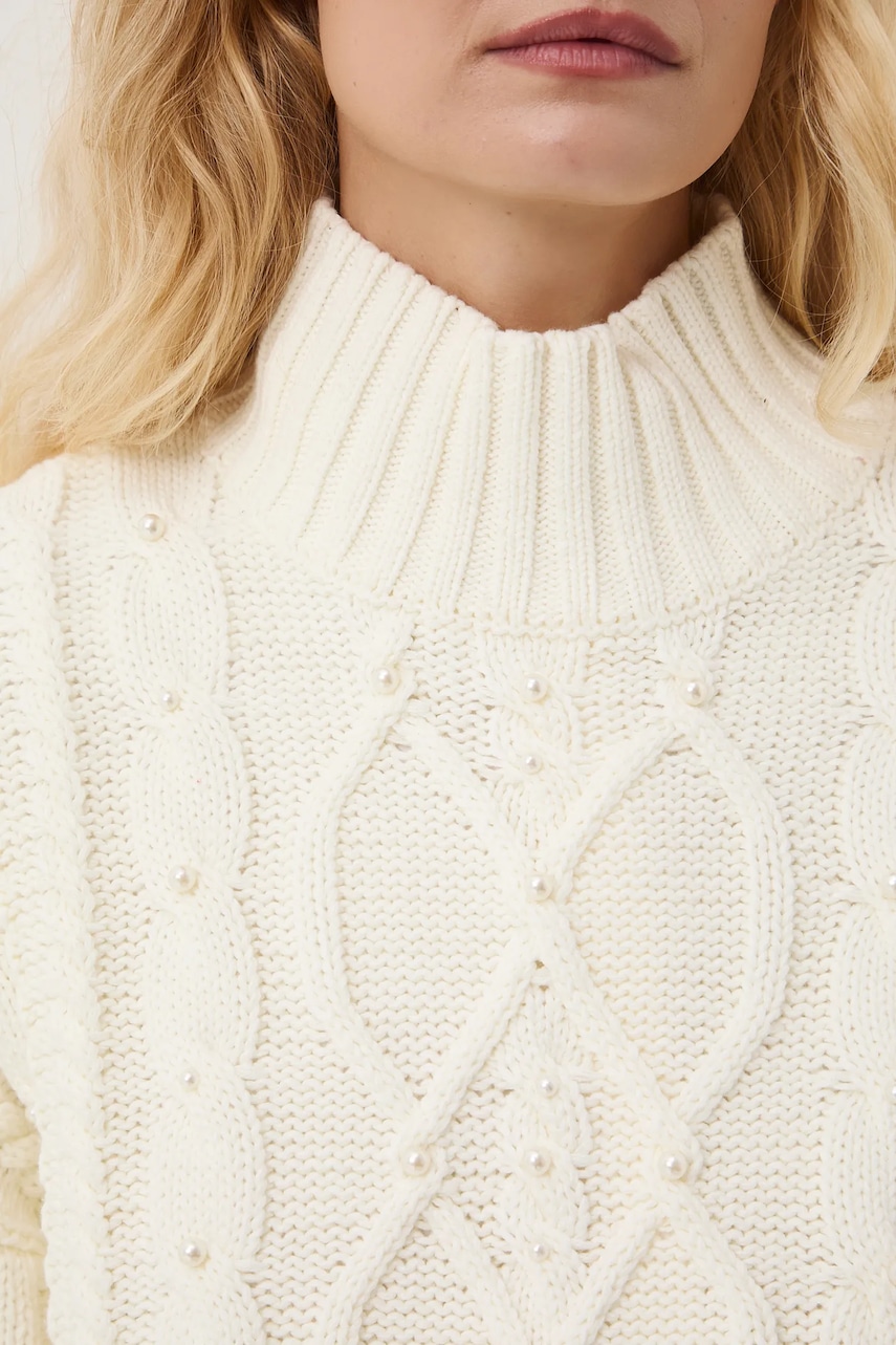 - Fason oversize. - Długi rękaw. - Obniżona linia ramion. - Model z półgolfem. - Wykończenie ze ściągacza. - Warkoczowy splot. - Model z ozdobną aplikacją z koralików imitujących perły. - Długość rękawa(mierzona od kołnierza): 68 cm. - Długość: 55 cm. - Szerokość w biuście: 57 cm. - Wymiary podane dla rozmiaru: S.