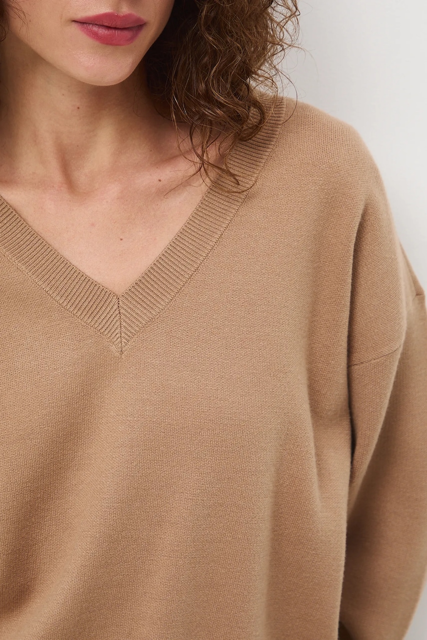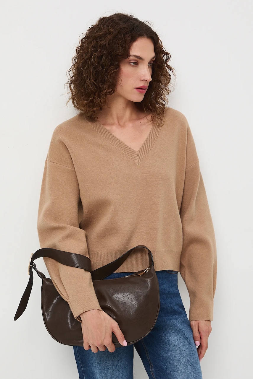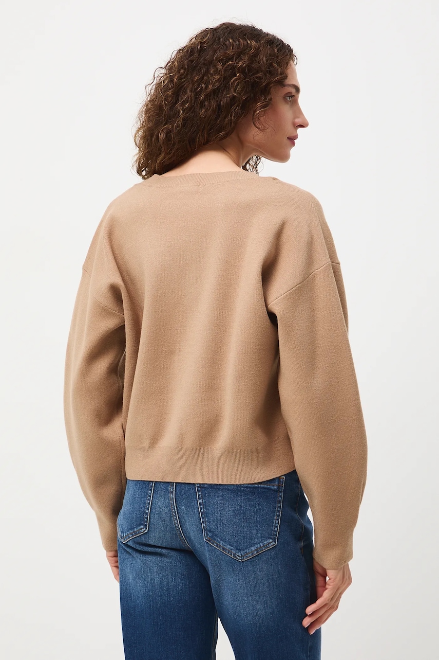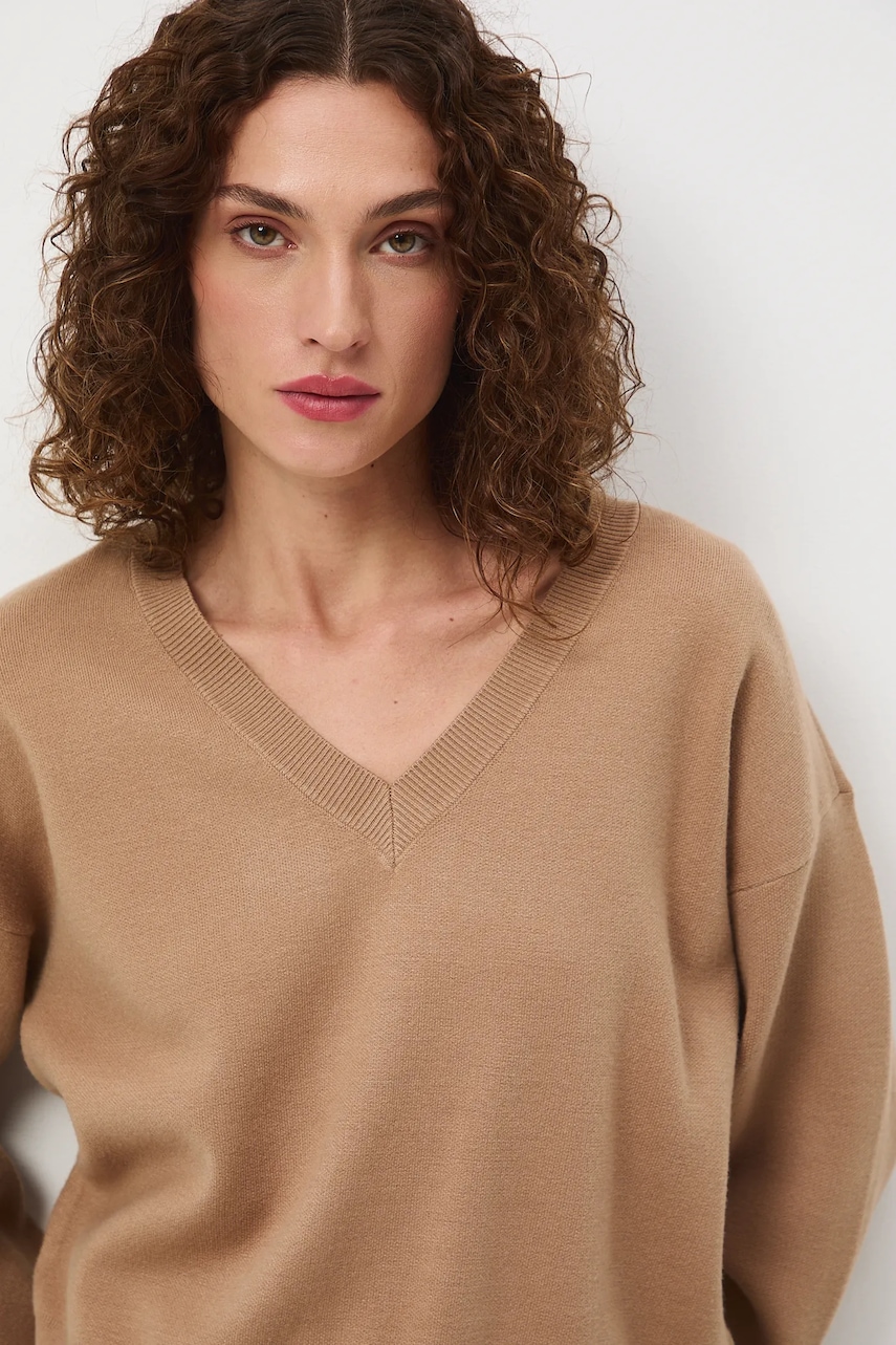 - Fason regular. - Długi rękaw. - Obniżona linia ramion. - Ozdobne marszczenia przy rękawach. - Spiczasty dekolt. - Wykończenie ze ściągacza. - Gładka dzianina. - Długość rękawa(mierzona od dekoltu): 70,5 cm. - Długość: 55 cm. - Szerokość w biuście: 55 cm. - Wymiary podane dla rozmiaru: S.