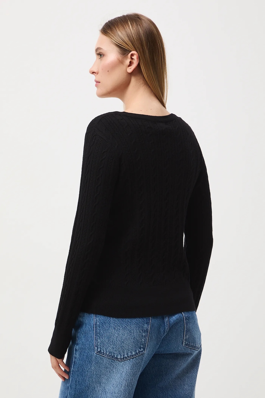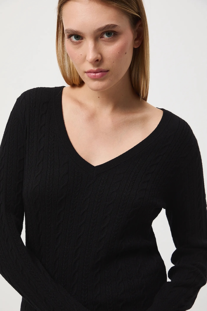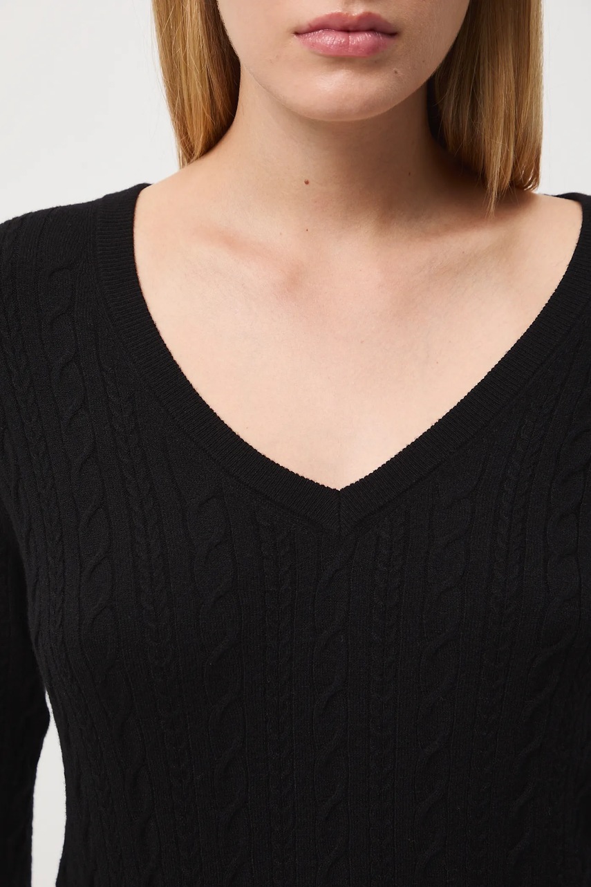 - Sweter w fasonie slim jest dopasowany do ciała i naturalnie podkreśla sylwetkę. Odpowiedni do eleganckich, jak i casualowych stylizacji. - Długi rękaw. - Spiczasty dekolt. - Wykończenie ze ściągacza. - Warkoczowy splot. - Długość rękawa: 58,5 cm. - Długość: 58 cm. - Szerokość w biuście: 42 cm. - Wymiary podane dla rozmiaru: S.