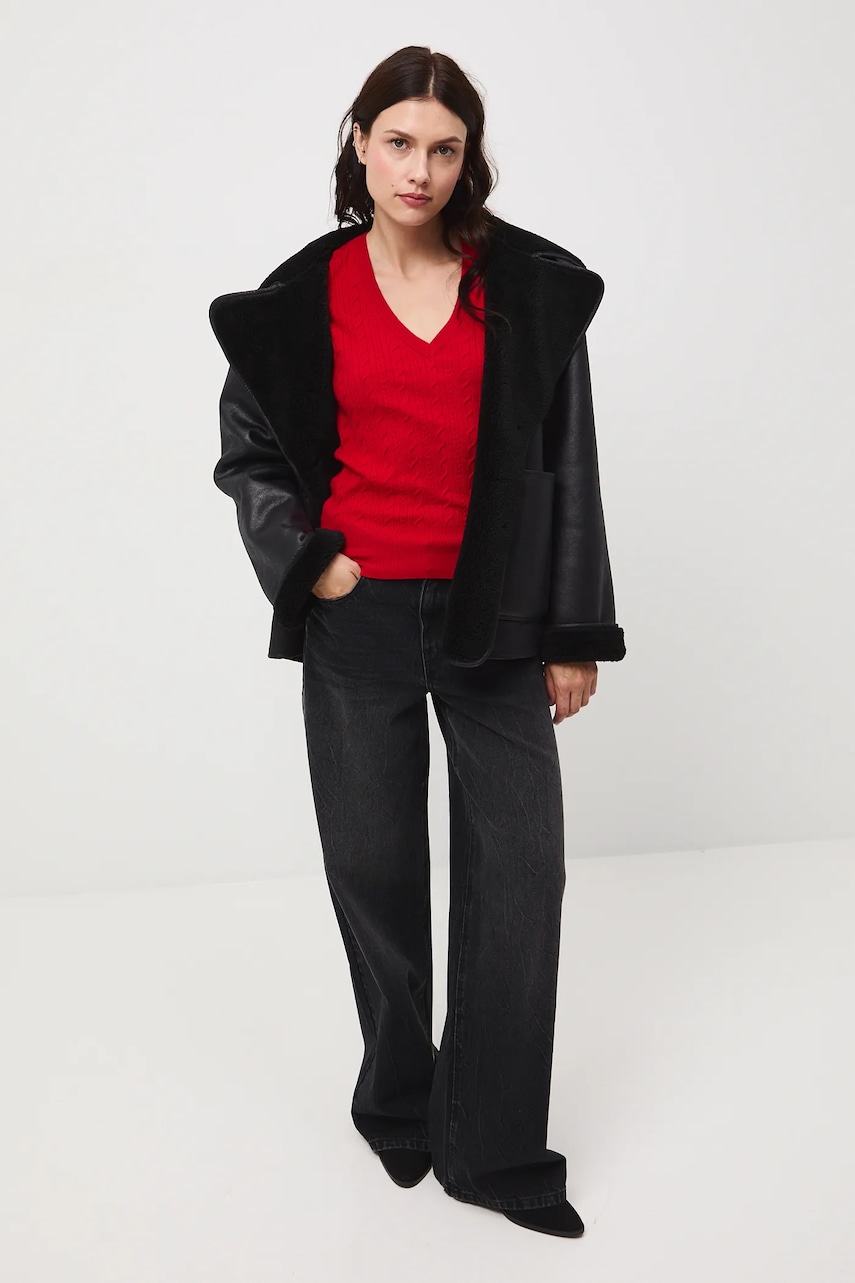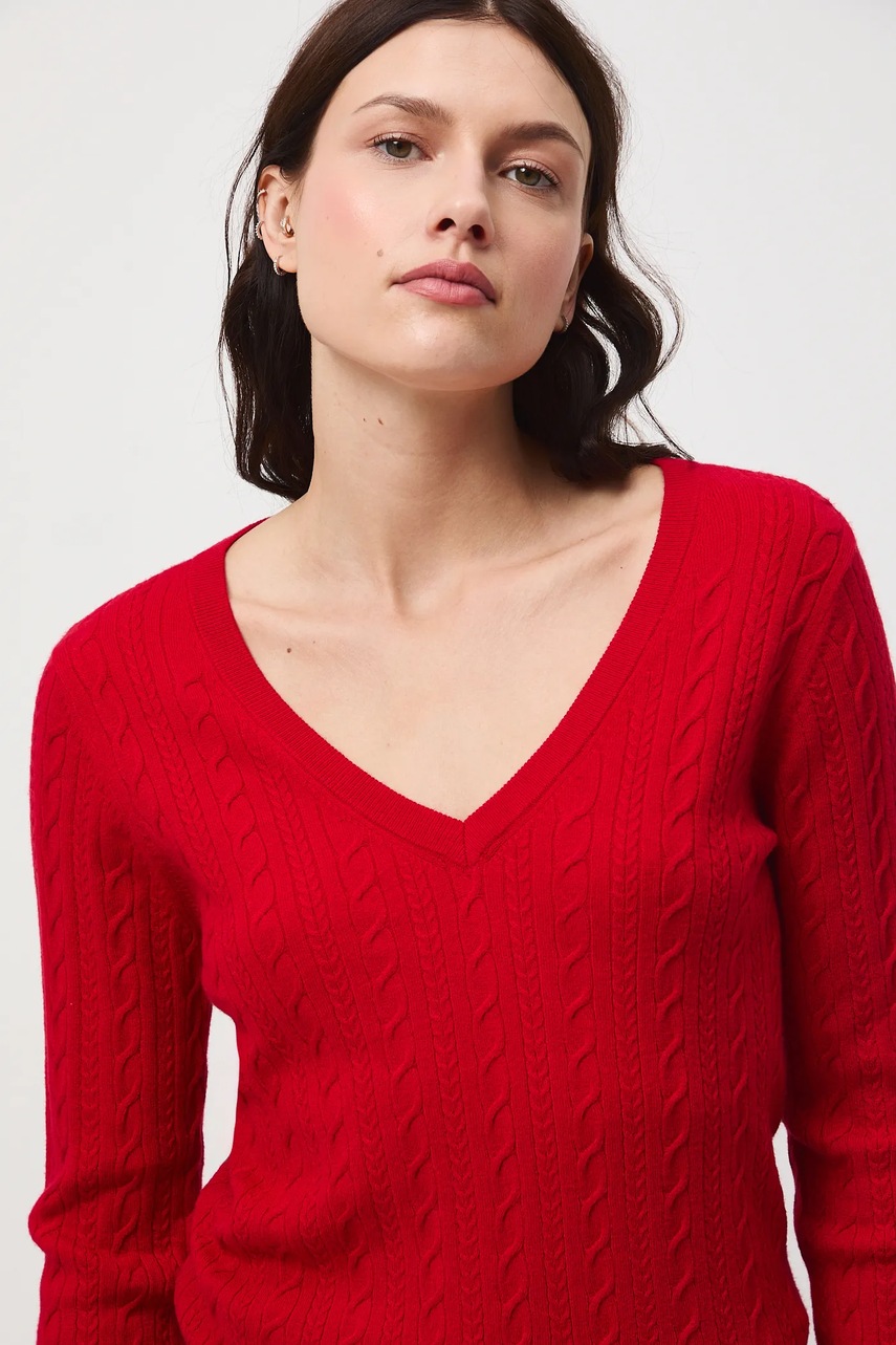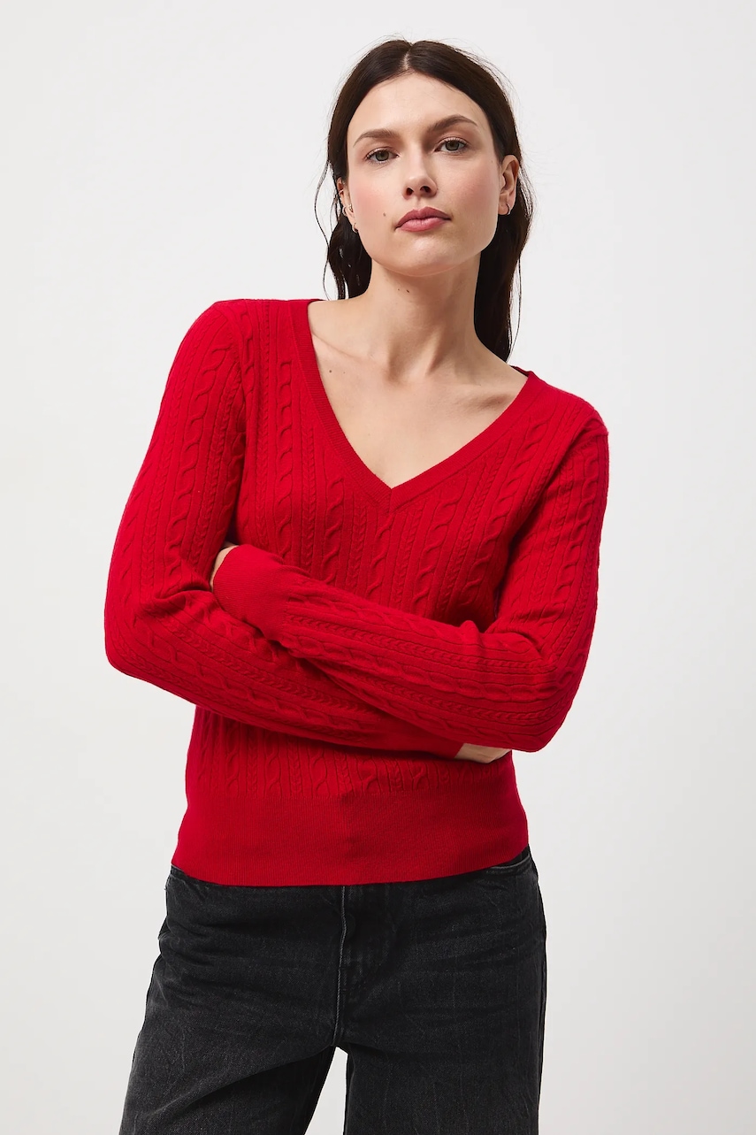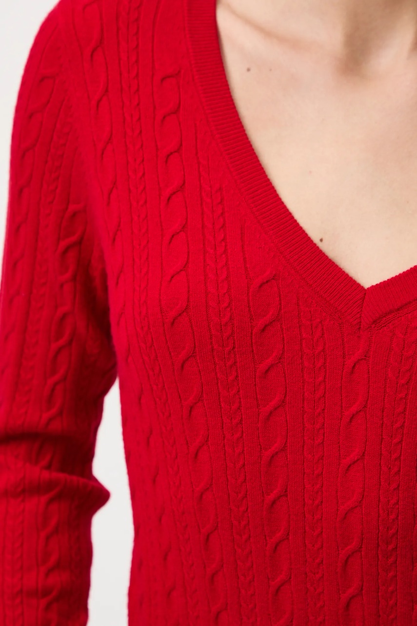 - Sweter w fasonie slim jest dopasowany do ciała i naturalnie podkreśla sylwetkę. Odpowiedni do eleganckich, jak i casualowych stylizacji. - Długi rękaw. - Spiczasty dekolt. - Wykończenie ze ściągacza. - Warkoczowy splot. - Długość rękawa: 58,5 cm. - Długość: 58 cm. - Szerokość w biuście: 42 cm. - Wymiary podane dla rozmiaru: S.