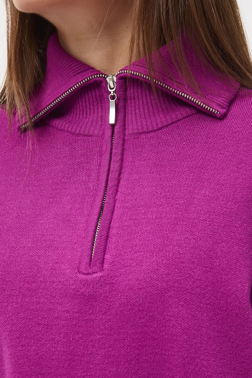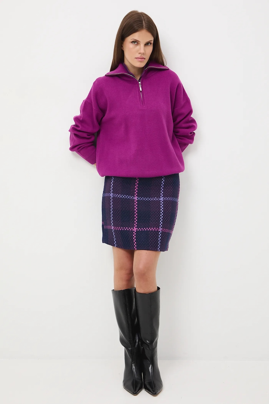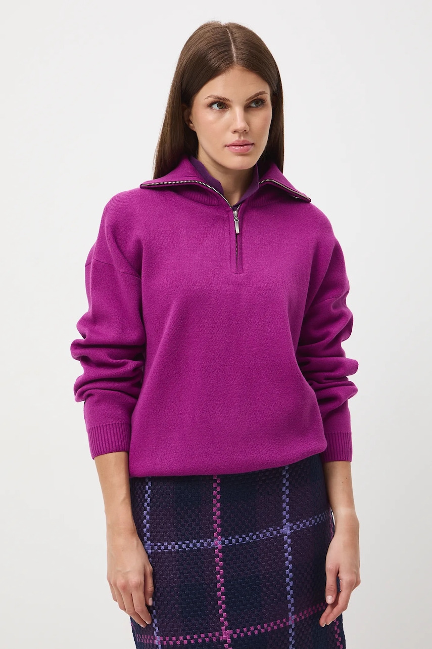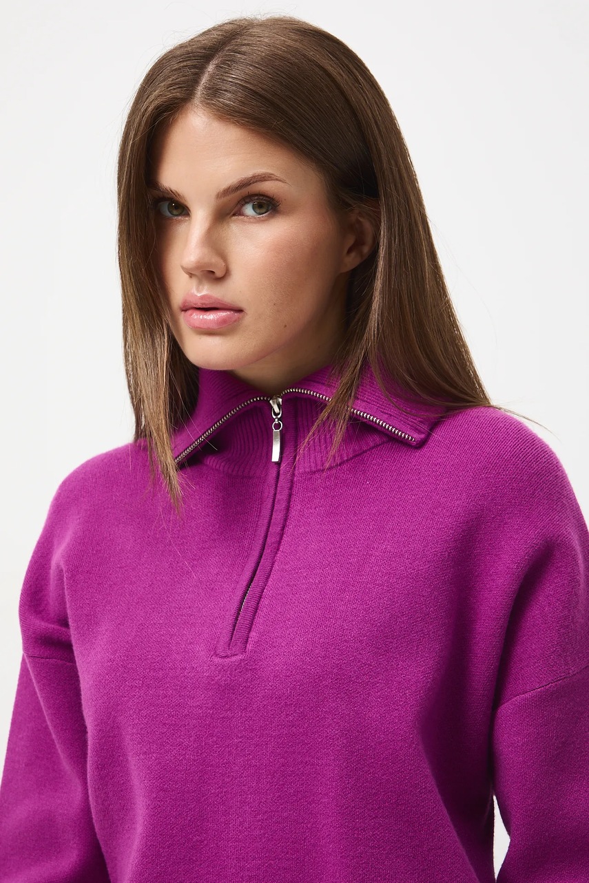 - Fason oversize. - Długi rękaw. - Obniżona linia ramion. - Półgolf z krótkim zapięciem na suwak. - Wykończenie ze ściągacza. - Gładka dzianina. - Długość rękawa(mierzona od kołnierza): 70,3 cm. - Długość: 59 cm. - Szerokość w biuście: 57 cm. - Wymiary podane dla rozmiaru: S.