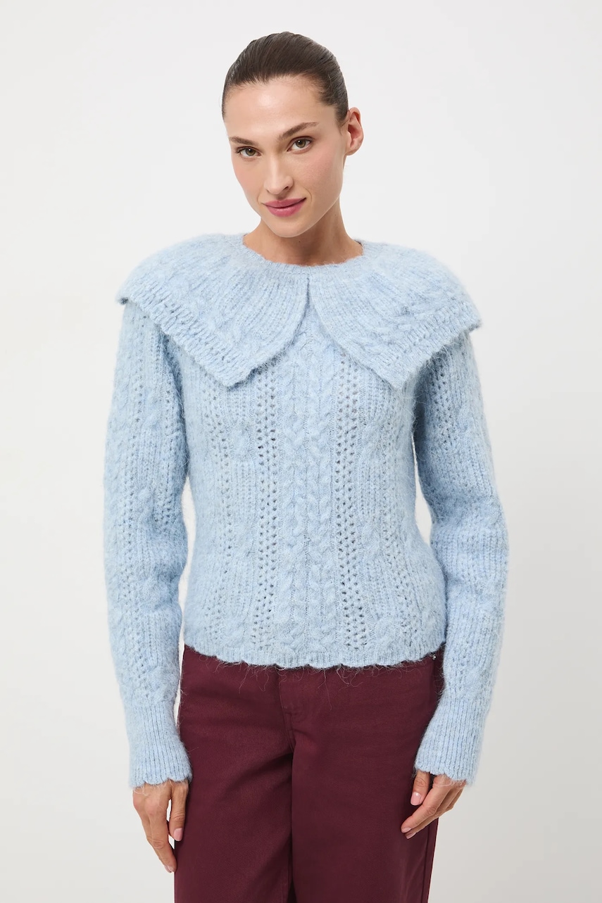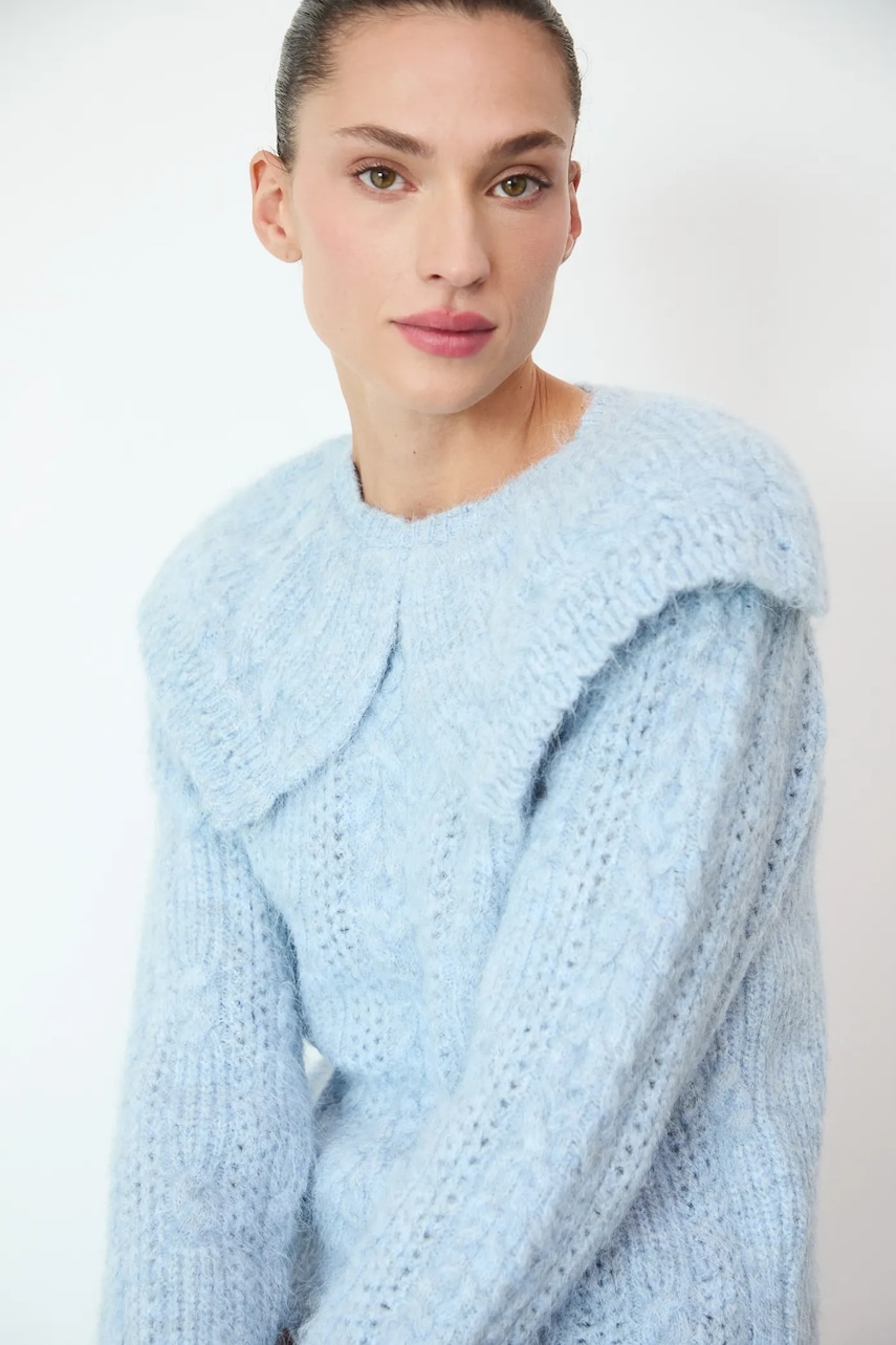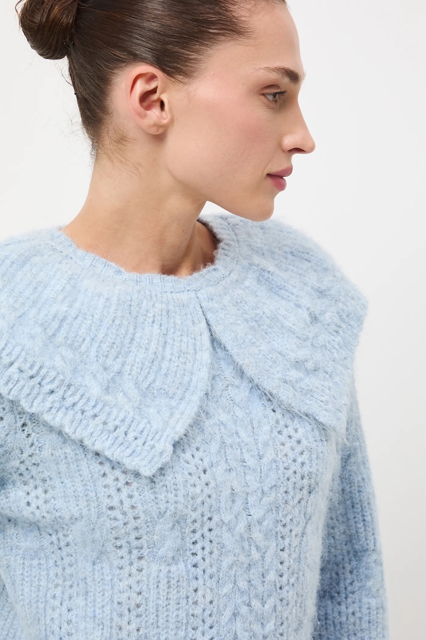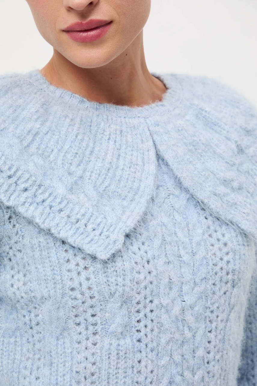 - Sweter w fasonie slim jest dopasowany do ciała i naturalnie podkreśla sylwetkę. Odpowiedni do eleganckich, jak i casualowych stylizacji. - Długi rękaw. - Model z kołnierzem. - Model wykonany z ażurowego materiału. - Ozdobne wykończenia. - Dzianina średniej grubości. - Długość rękawa: 64,5 cm. - Długość: 56 cm. - Szerokość w biuście: 45 cm. - Wymiary podane dla rozmiaru: S.