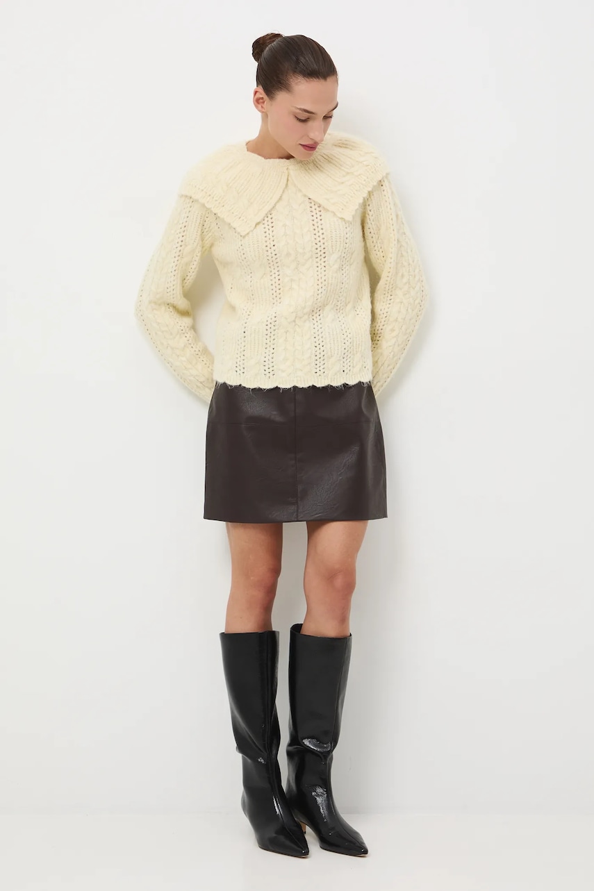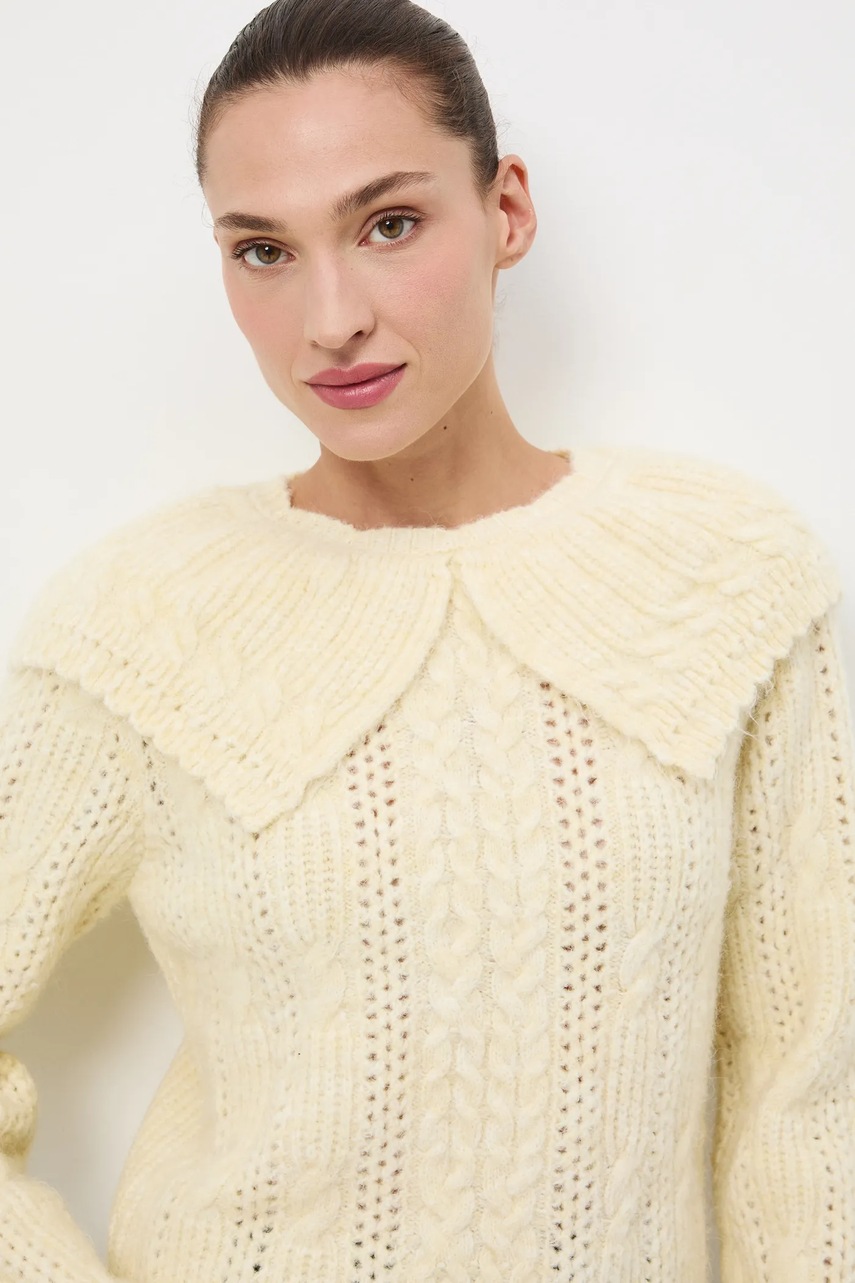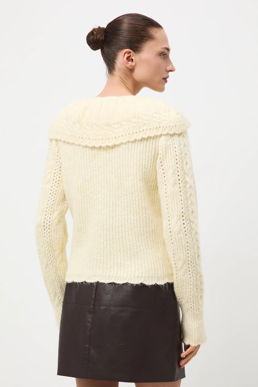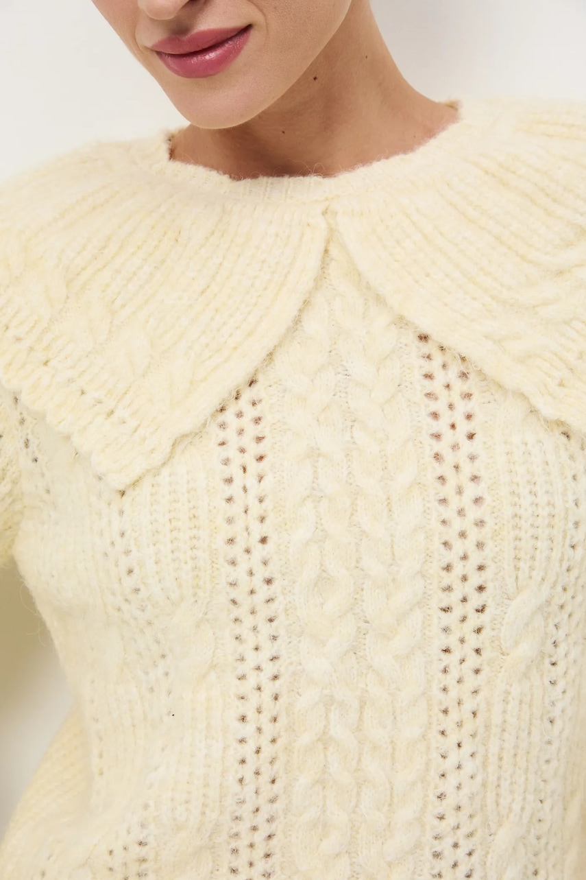 - Sweter w fasonie slim jest dopasowany do ciała i naturalnie podkreśla sylwetkę. Odpowiedni do eleganckich, jak i casualowych stylizacji. - Długi rękaw. - Model z kołnierzem. - Model wykonany z ażurowego materiału. - Ozdobne wykończenia. - Dzianina średniej grubości. - Długość rękawa: 64,5 cm. - Długość: 56 cm. - Szerokość w biuście: 45 cm. - Wymiary podane dla rozmiaru: S.