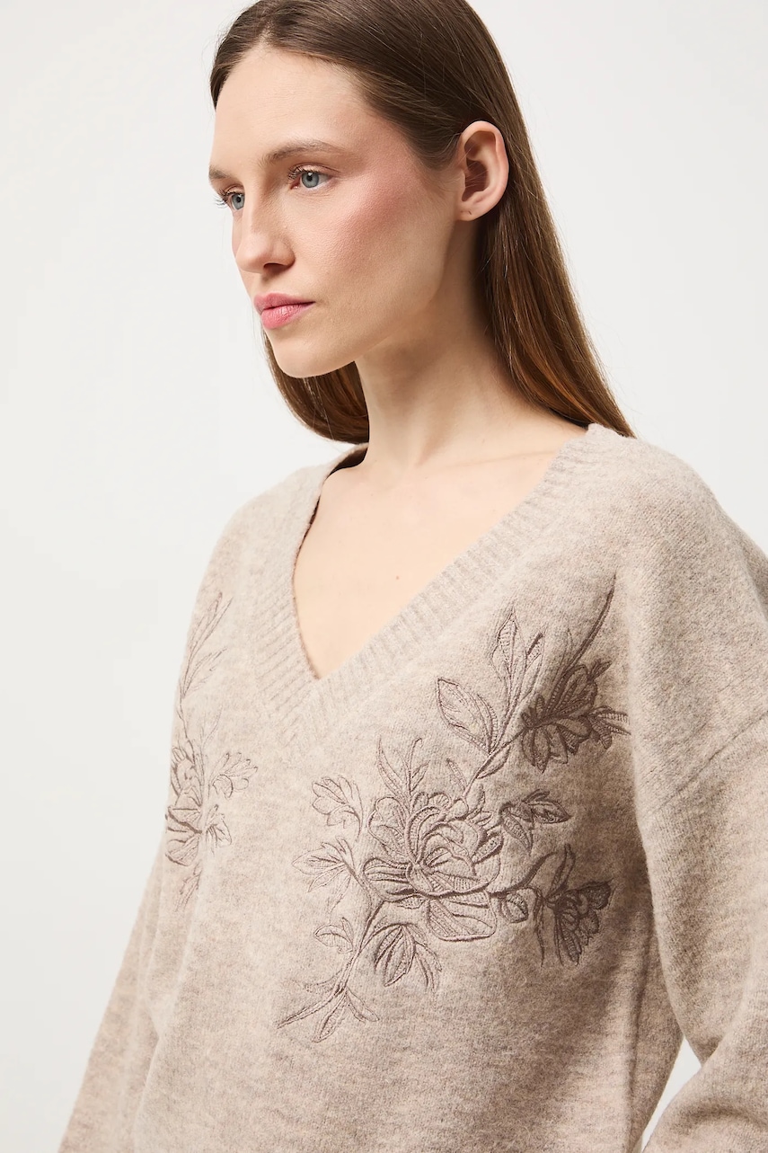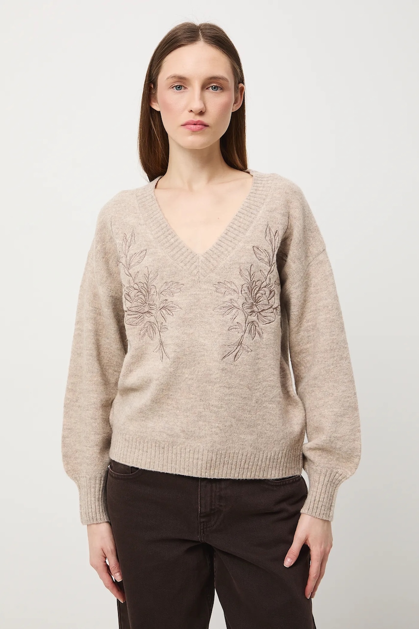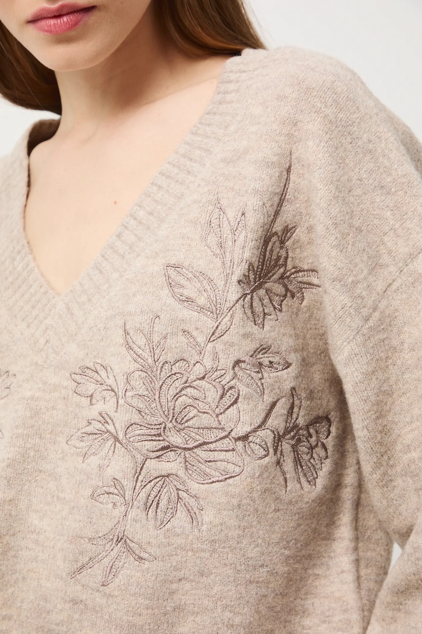 - Sweter w fasonie regular zapewnia wygodę i uniwersalny wygląd. Delikatnie dopasowuje się do sylwetki, ale nie podkreśla jej nadmiernie. Klasyczny i prosty, sprawdzi się zarówno w eleganckich, jak i casualowych stylizacjach. - Długi rękaw. - Obniżona linia ramion. - Spiczasty dekolt. - Wykończenie ze ściągacza. - Model z ozdobnymi haftami. - Haft z motywem roślinnym. - Długość rękawa(mierzona od dekoltu): 70,5 cm. - Długość: 59,5 cm. - Szerokość w biuście: 53 cm. - Wymiary podane dla rozmiaru: S.