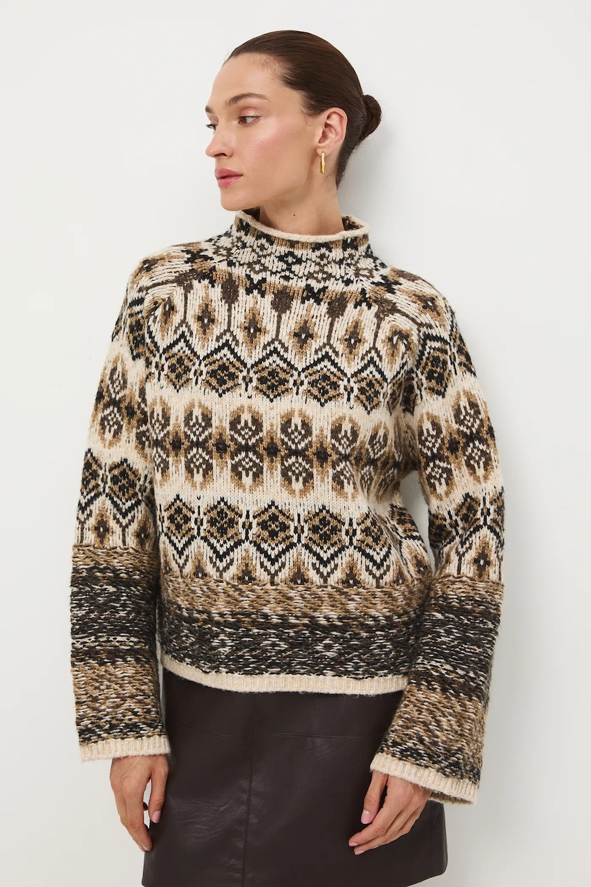 - Sweter w fasonie regular zapewnia wygodę i uniwersalny wygląd. Delikatnie dopasowuje się do sylwetki, ale nie podkreśla jej nadmiernie. Klasyczny i prosty, sprawdzi się zarówno w eleganckich, jak i casualowych stylizacjach. - Długi, raglanowy rękaw. - Model z półgolfem. - Wzorzysta dzianina. - Wzorzysta, żakardowa dzianina. - Geometryczny wzór. - Komfortowa dzianina z domieszką wełny. - Długość rękawa(mierzona od dekoltu): 71,6 cm. - Długość: 59,5 cm. - Szerokość w biuście: 55 cm. - Wymiary podane dla rozmiaru: S.