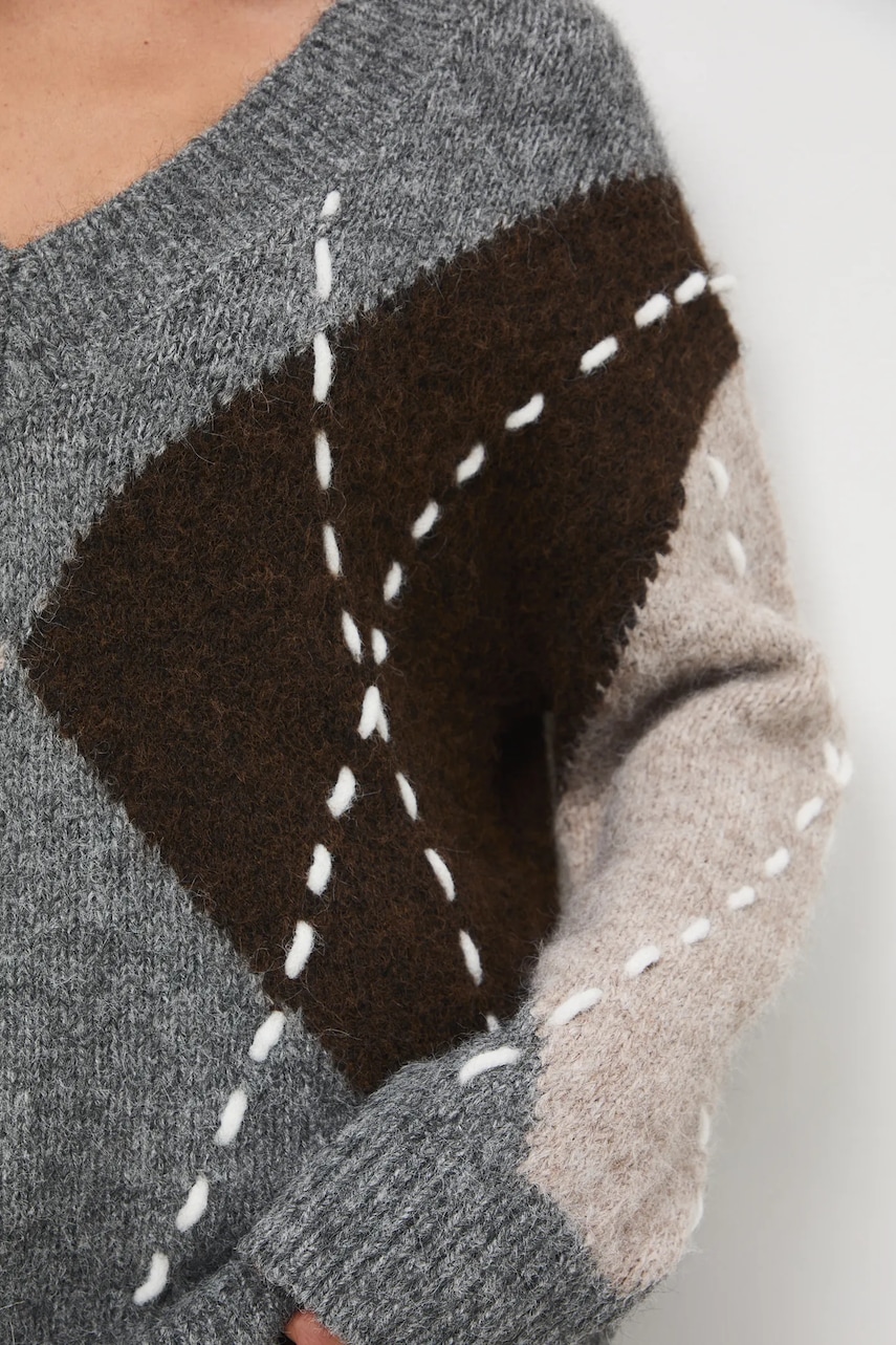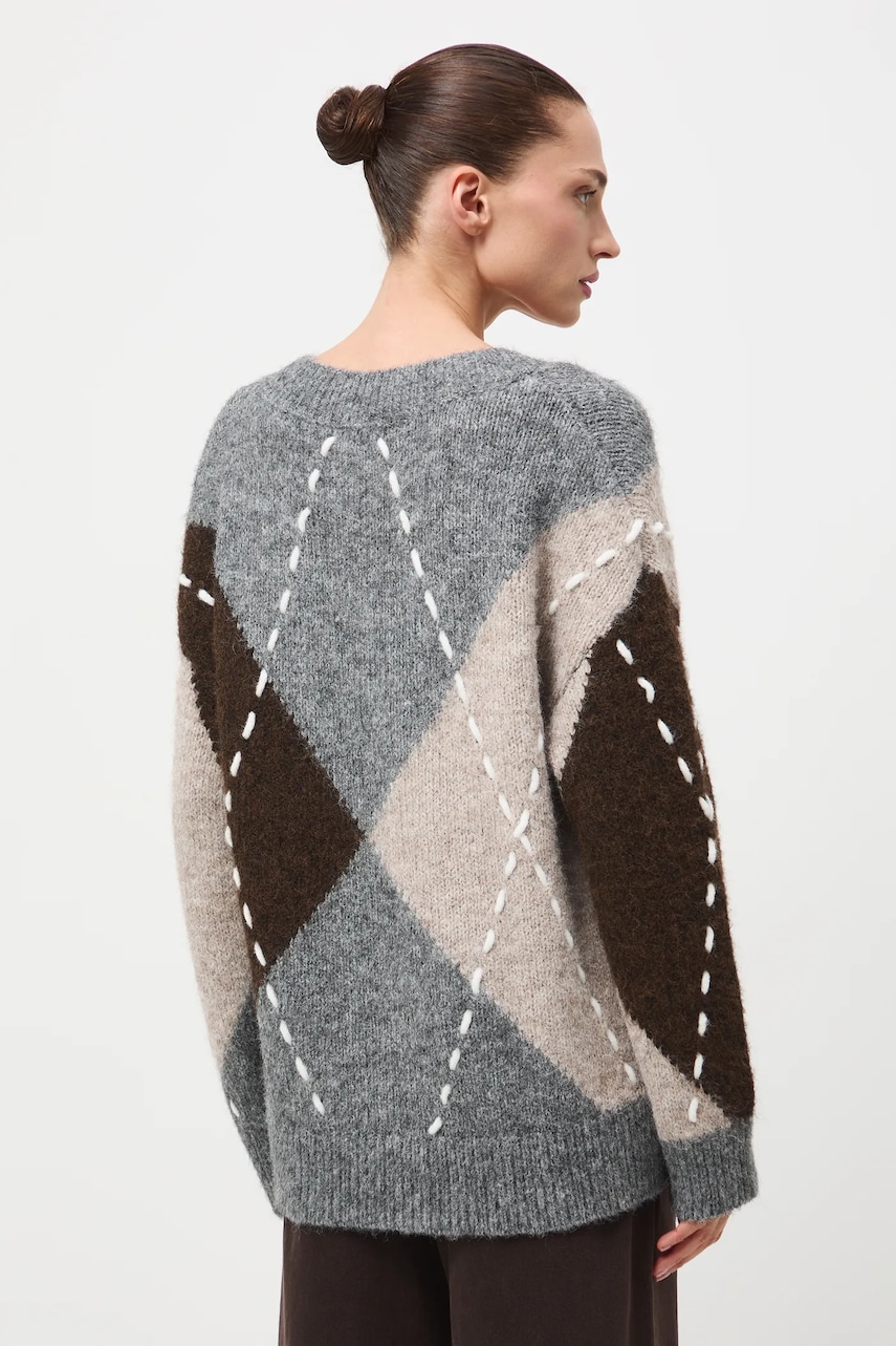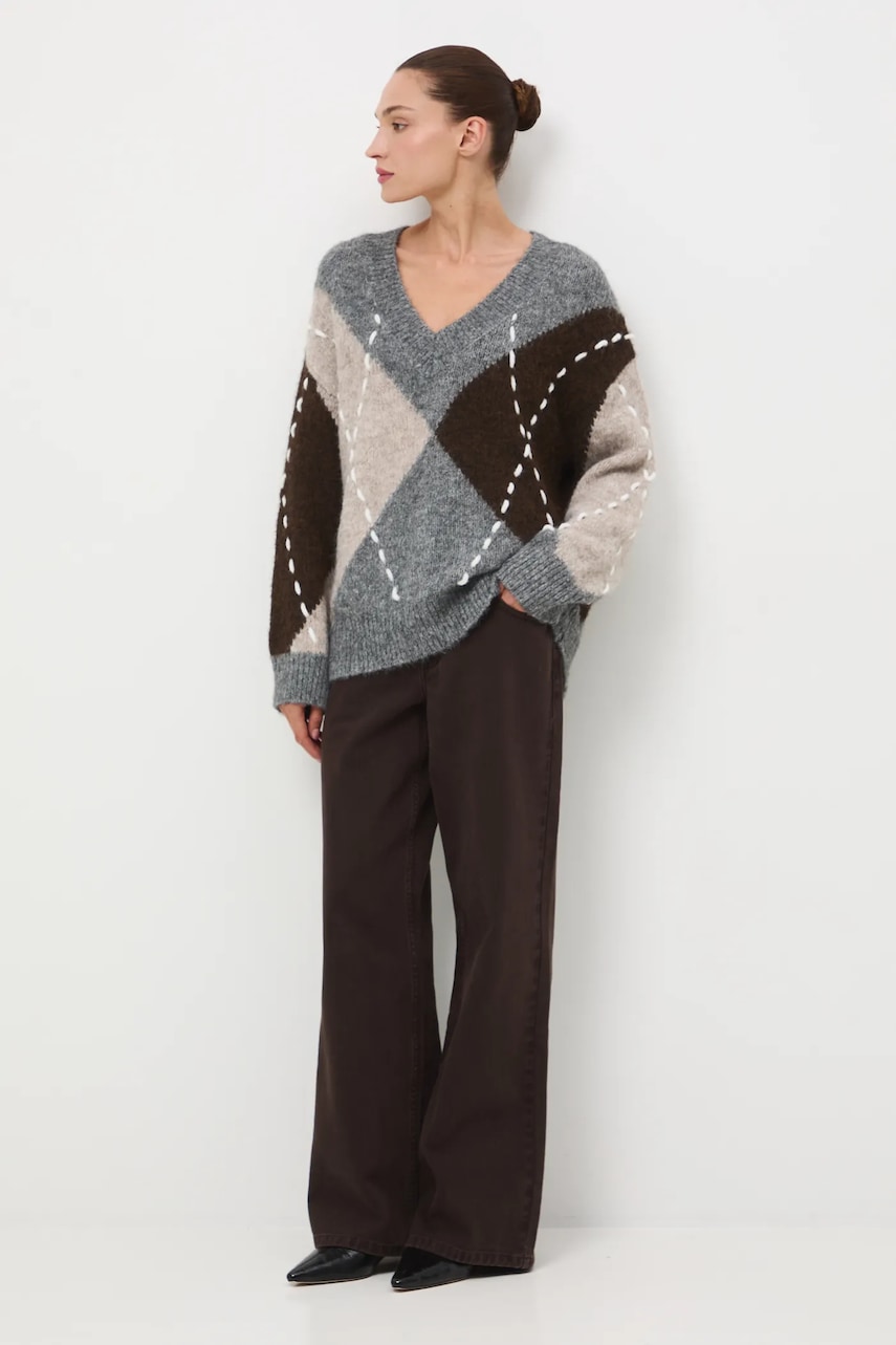 - Fason oversize. - Długi rękaw. - Obniżona linia ramion. - Spiczasty dekolt. - Wykończenie ze ściągacza. - Ozdobne przeszycia. - Wzorzysta dzianina. - Komfortowa dzianina z domieszką wełny. - Długość rękawa(mierzona od dekoltu): 72 cm. - Długość: 66 cm. - Szerokość w biuście: 56 cm. - Wymiary podane dla rozmiaru: S.