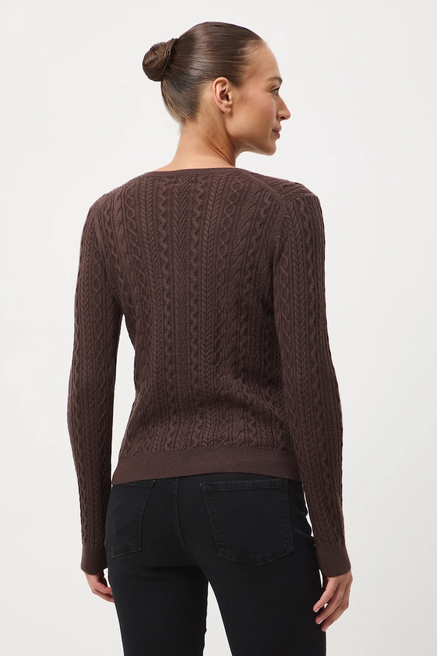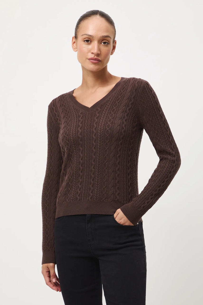 - Sweter wykonany w 100% z wełny merino. - Sweter w fasonie regular zapewnia wygodę i uniwersalny wygląd. Delikatnie dopasowuje się do sylwetki, ale nie podkreśla jej nadmiernie. Klasyczny i prosty, sprawdzi się zarówno w eleganckich, jak i casualowych stylizacjach. - Długi rękaw. - Spiczasty dekolt. - Wykończenie ze ściągacza. - Warkoczowy splot. - Melanżowa dzianina. - Długość rękawa: 59 cm. - Długość: 57 cm. - Szerokość w biuście: 45 cm. - Wymiary podane dla rozmiaru: S.